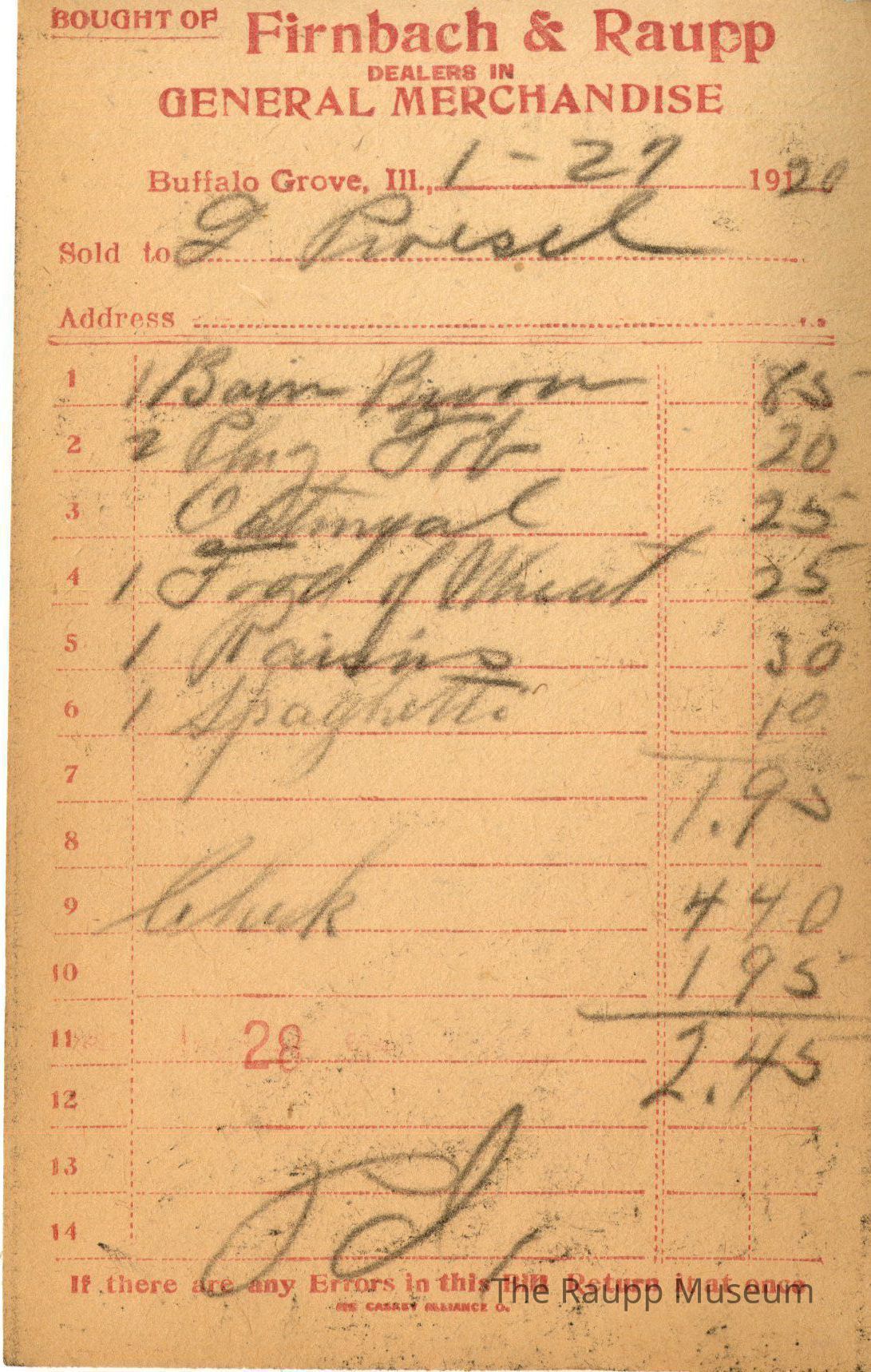 One (1) Firnbach and Raupp store receipt from January 27, 1920. Receipt is rectangular with red printed text and handwritten notes in pencil. The receipt is for J. Piresel (?) who bought one barn broom for $0.85, two plug tab for $0.20, one order of oatmeal for $0.25, one food of wheat for $0.25, one box of raisins for $0.30, and one order of spaghetti for $0.10. The bill total is $1.95. On line nine there is a 'check' for $4.40, the bill total is subtracted from the check leaving $2.45 left to pay. There is a red stamp of 28 on the eleventh line with the bill marked as paid below.
