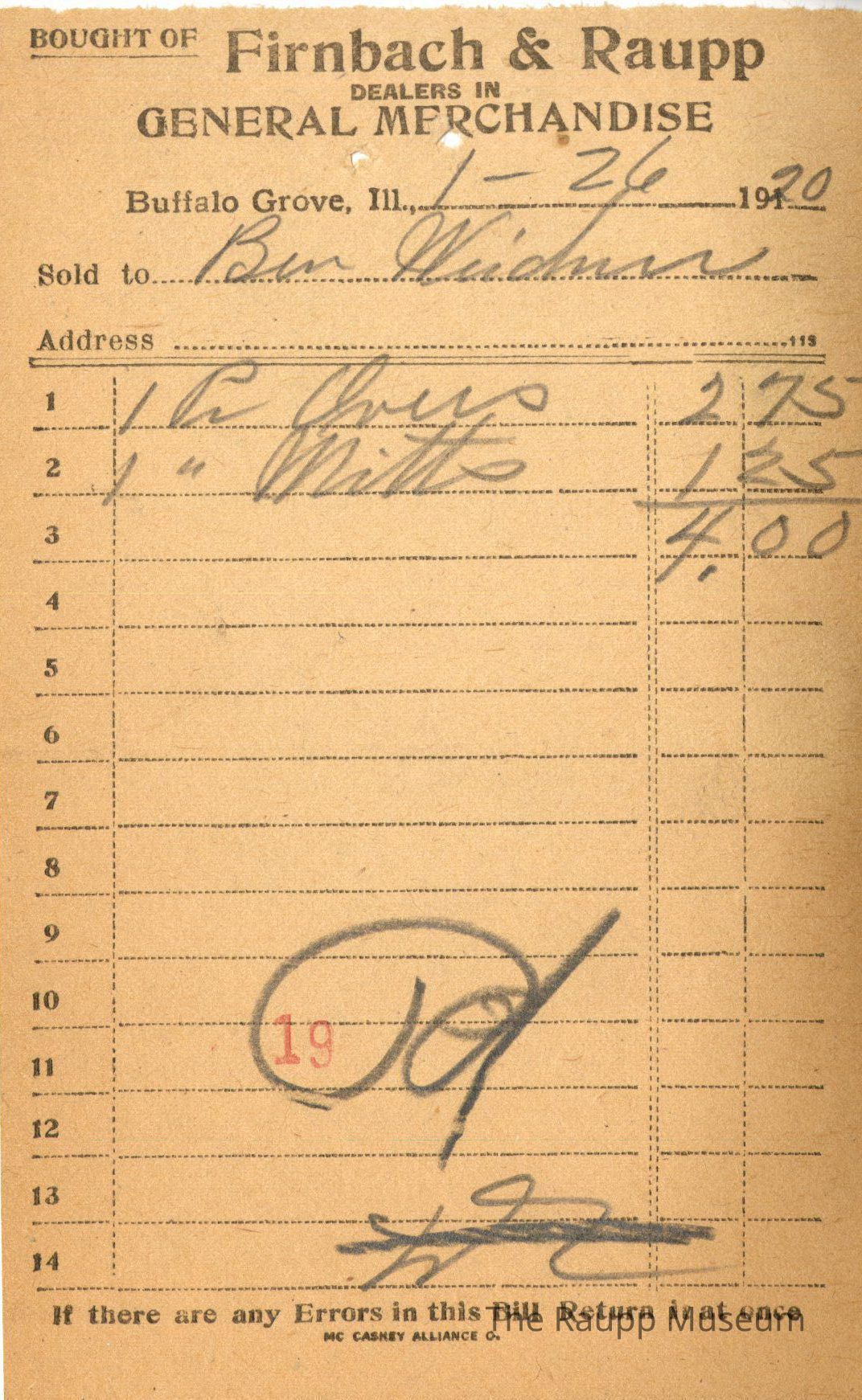 One (1) Firnbach and Raupp store receipt from January 26, 1920. Receipt is rectangular with black printed text and handwritten notes in pencil. The receipt is for Ben Weidner who bought one pair of overs (could be short for overalls) for $2.75, one pair of mitts for $1.25. The bill total comes out to $4.00. There is a red stamp of 19 on the eleventh line with the bill marked as paid below.