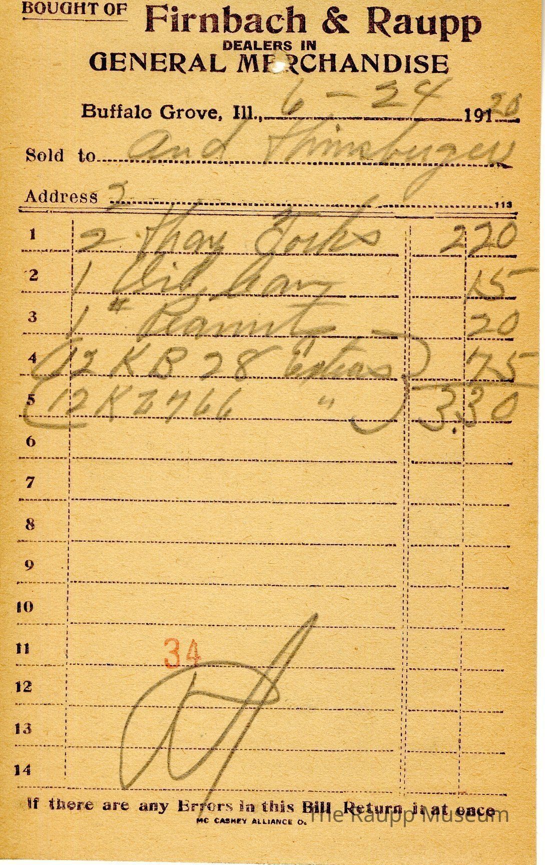 The black text is as follows, from top to bottom bought of Firnback & Raupp; Dealers in General Merchandise; Buffalo Grove, Ill.; Sold to; Address; If there are any Errors in this Bill Return it at once; MC CASKEY ALLIANCE O.Archive Details