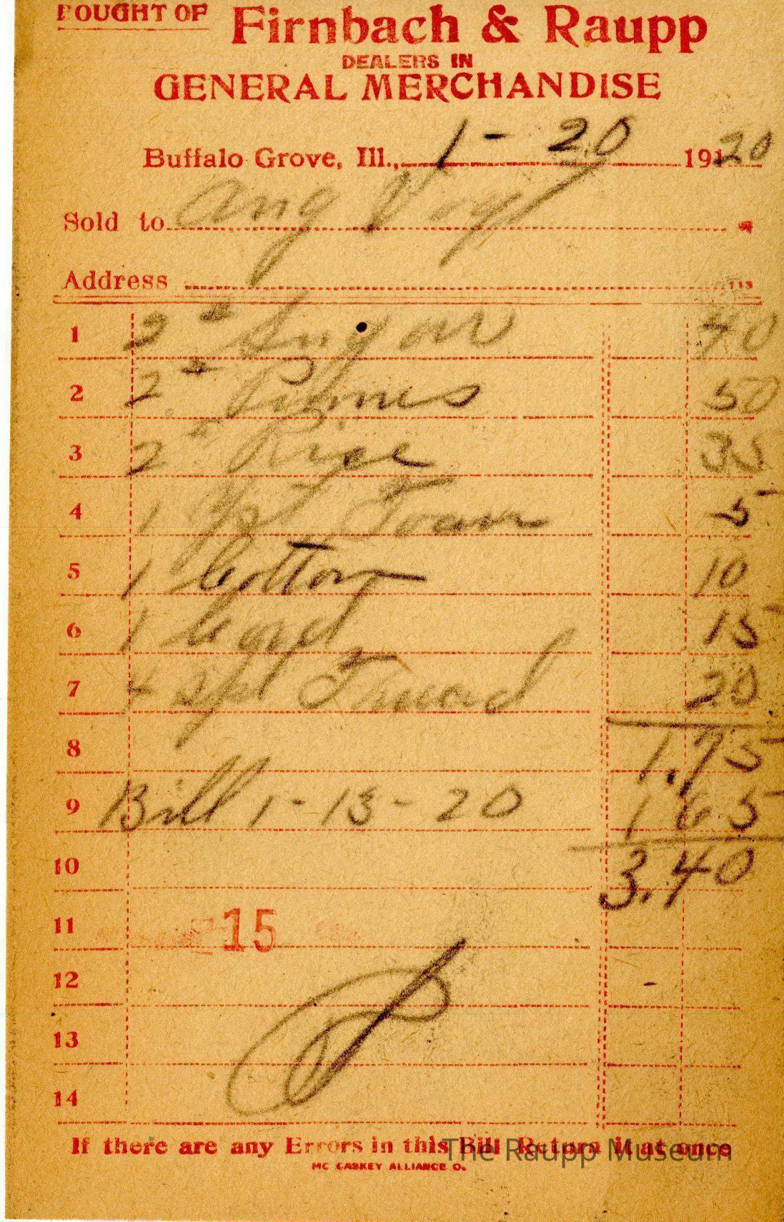 The red text is as follows, from top to bottom: "Bought of Firnbach and Raupp dealers in GENERAL MERCHANDISE" Buffalo Grove Ill.; Sold to; address; if there are any Errors in this Bill Return it at once; MC CASKEY ALLIANCE O."Archive Details