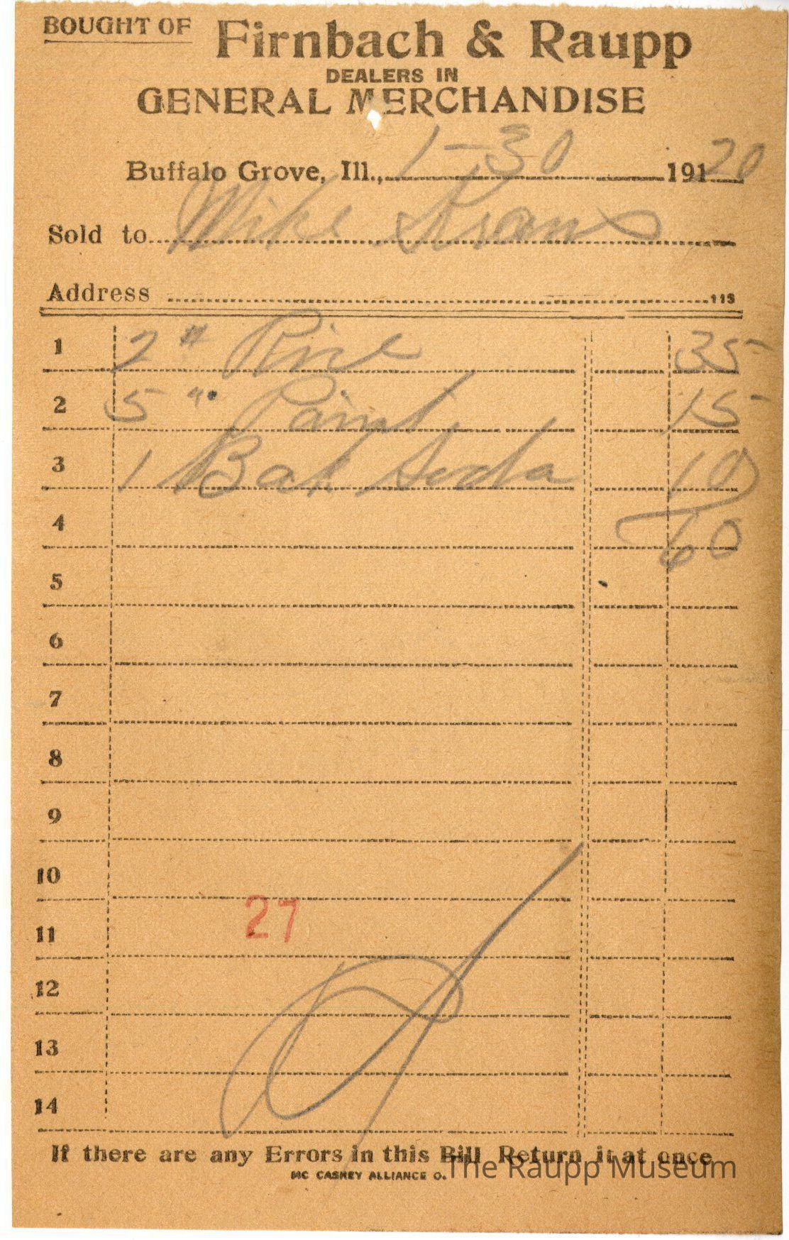 The black text is as follows, from top to bottom: "Bought of Firnbach and Raupp dealers in GENERAL MERCHANDISE" Buffalo Grove Ill.; Sold to address; if there are any Errors in this Bill Return it at once; MC CASKEY ALLIANCE O."Archive Details