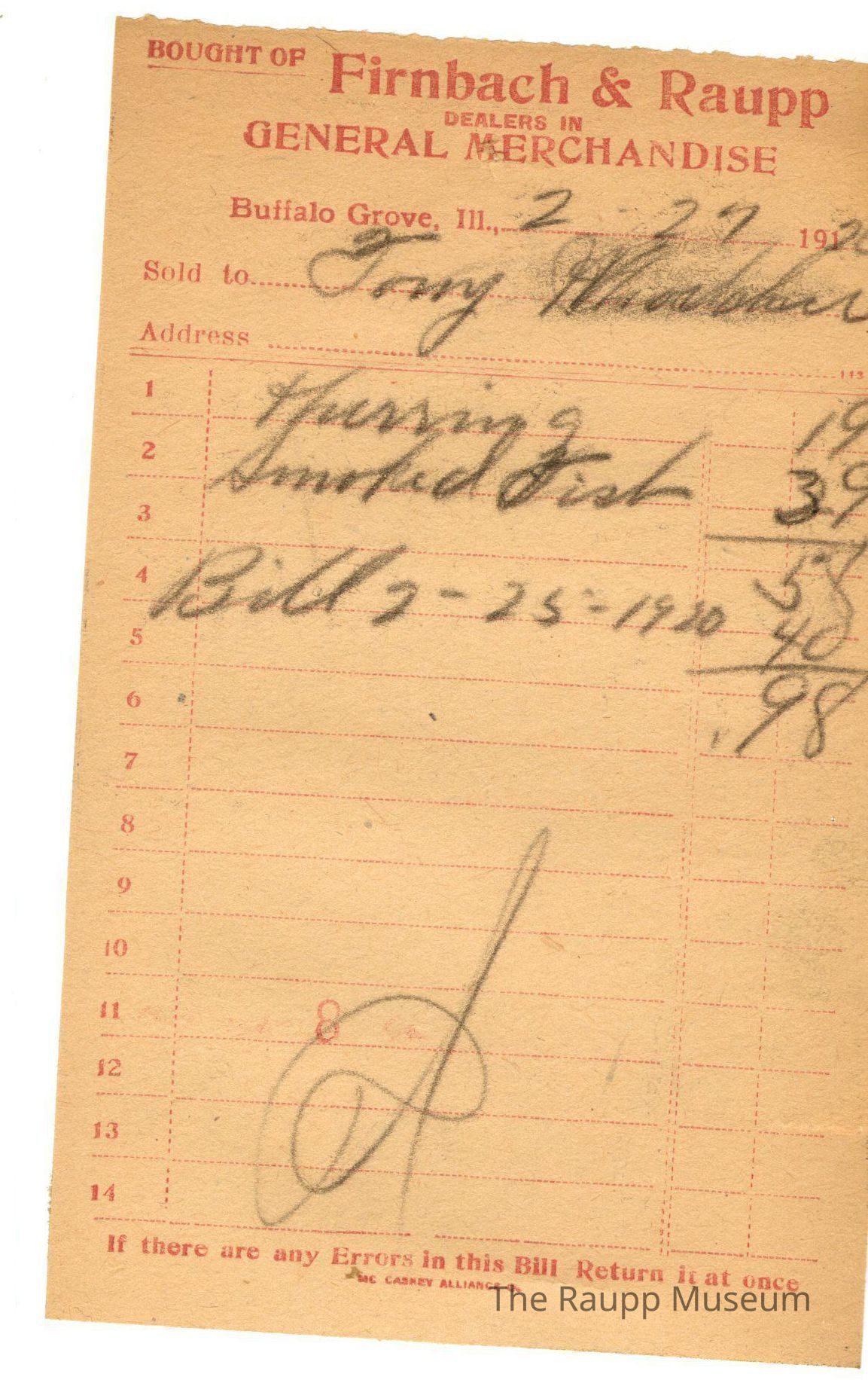 The black text is as follows, from top to bottom: "Bought of Firnbach and Raupp; Dealers in GENERAL MERCHANDISE; Buffalo Grove, Ill.; Sold to; Address; if there are any Errors in this Bill Return it at once; MC CASKEY ALLIANCE O."Archive Details