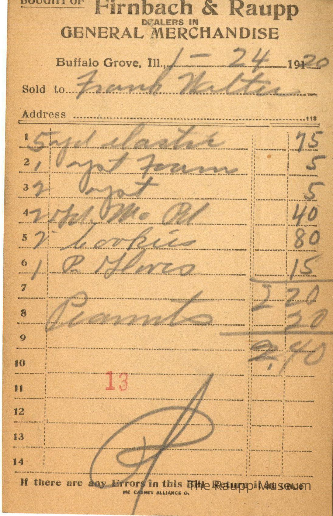 One (1) Firnbach and Raupp store receipt from January 24, 1920. Receipt is rectangular with black printed text and handwritten notes in pencil. The receipt is for Frank Welter who bought five yards of elastic for $0.75, one yeast foam for $0.05, two yeast for $0.05, two orders of machine powder for $0.40, two orders of cookies for $0.80, one pair of globes for $0.15 and one order of peanuts for $0.20. The bill total comes out to $2.40. On the eleventh line there is a red stamped 13 and beneath the bill is marked as paid.