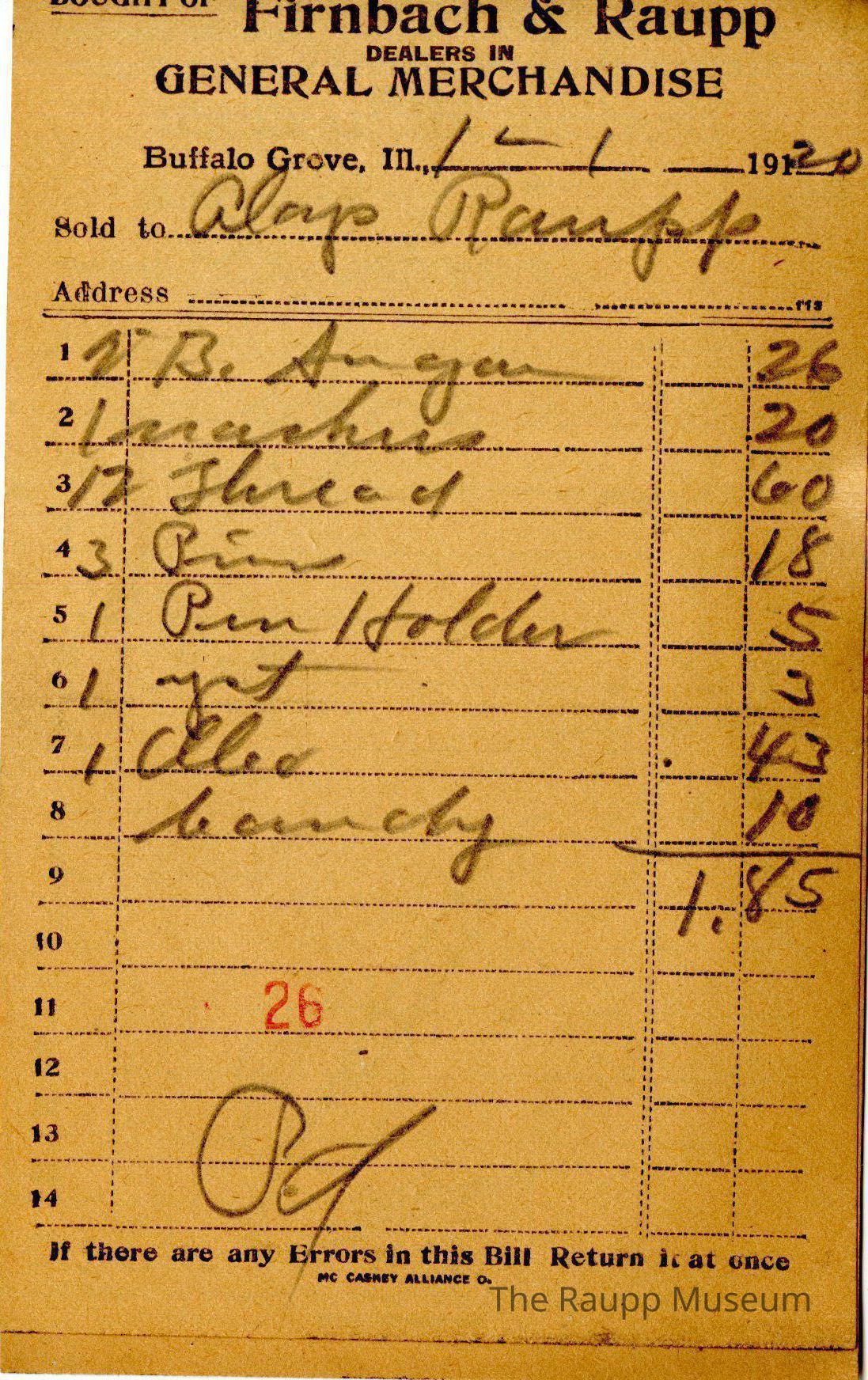 One (1) Firnbach and Raupp store receipt from January 1, 1920. Receipt is rectangular with black printed text and handwritten notes in pencil. The receipt is for Aloys Raupp who purchased two pounds of B. sugar for $0.26, one box of matches for $0.20, twelve thread for $0.60, three pins for $0.18, one pin holder for $0.05, one yeast for $0.03, one oleo for $0.43, and one candy for $0.10. The bill total comes out to $1.85.. On the eleventh line there is a red stamped 26, beneath it the bill is marked as having been paid.