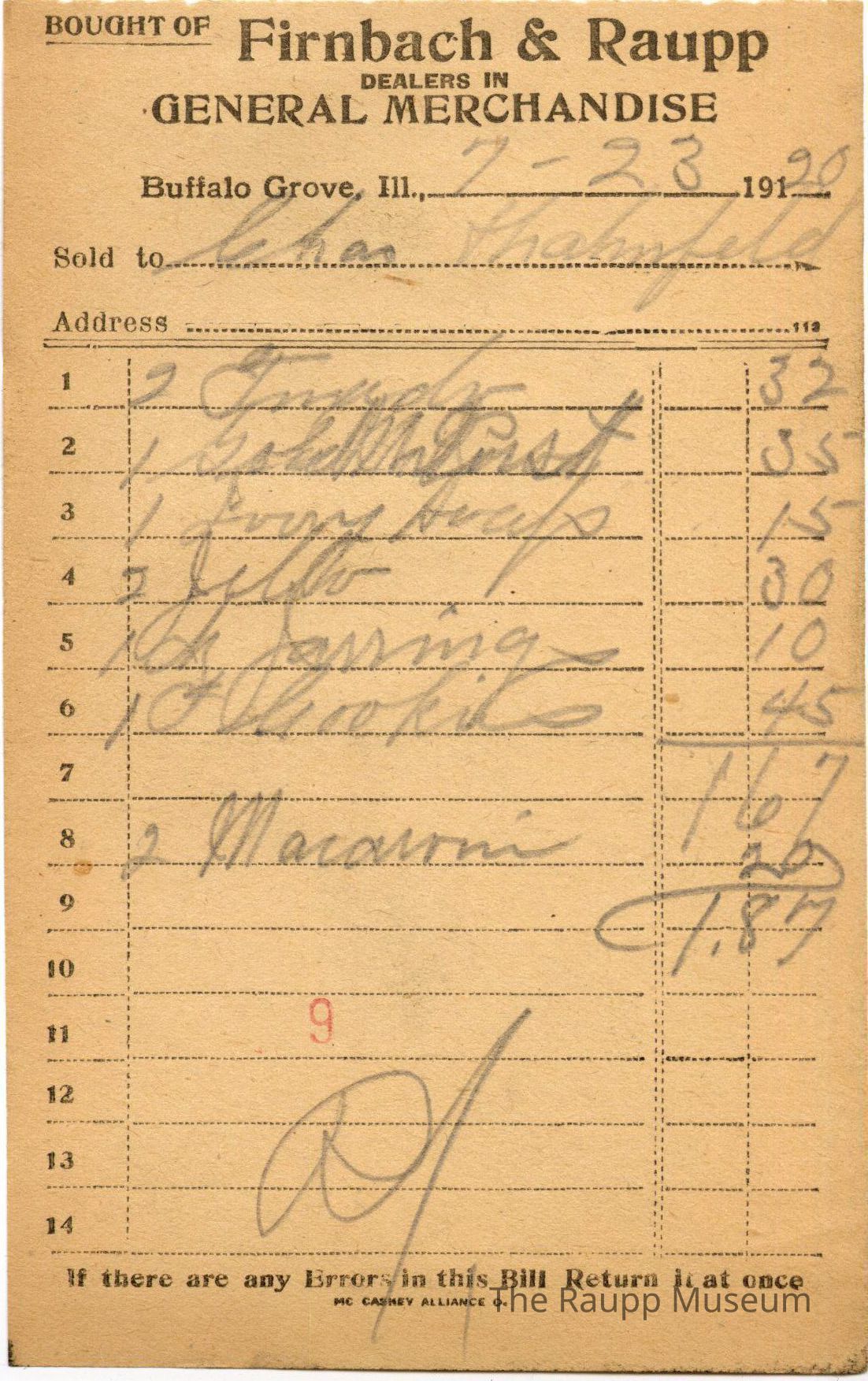 The black text is as follows, Bought of Firnbach and Raupp; Dealers in; General Merchandise; Buffalo Grove Ill.; Sold to; Address; If there are any Errors in this Bill Return it at once; MC CASKEY ALLIANCE O.