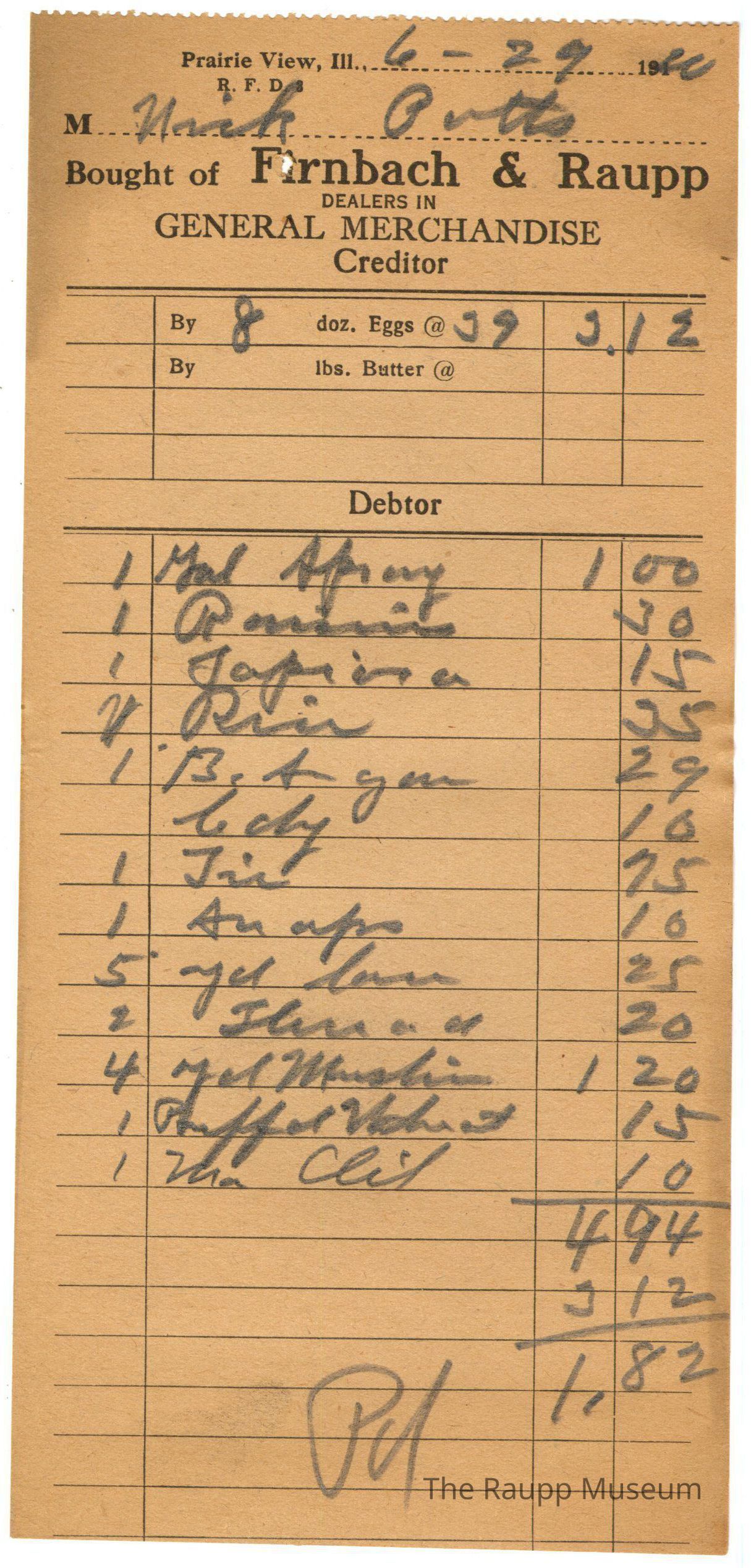 The black text is as follows, from top to bottom: Buffalo Grove, Ill., Bought of Firnbach & Raupp, Dealers in GENERAL MERCHANDISE; Creditor, By doz. Eggs @, By lbs. Butter @, DebtorArchive Details