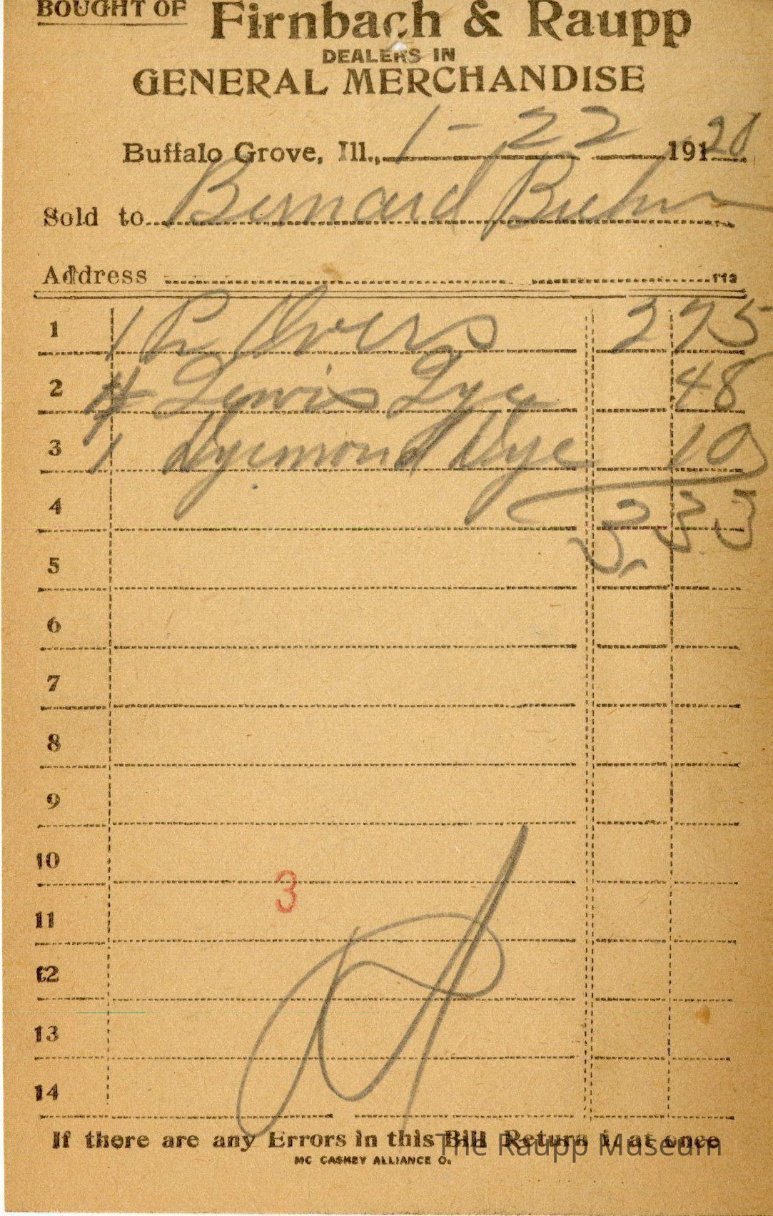 The black text is as follows, from top to bottom: "Bought of Firnbach and Raupp dealers in GENERAL MERCHANDISE" Buffalo Grove Ill.; Sold to; address; if there are any Errors in this Bill Return it at once; MC CASKEY ALLIANCE O."Archive Details