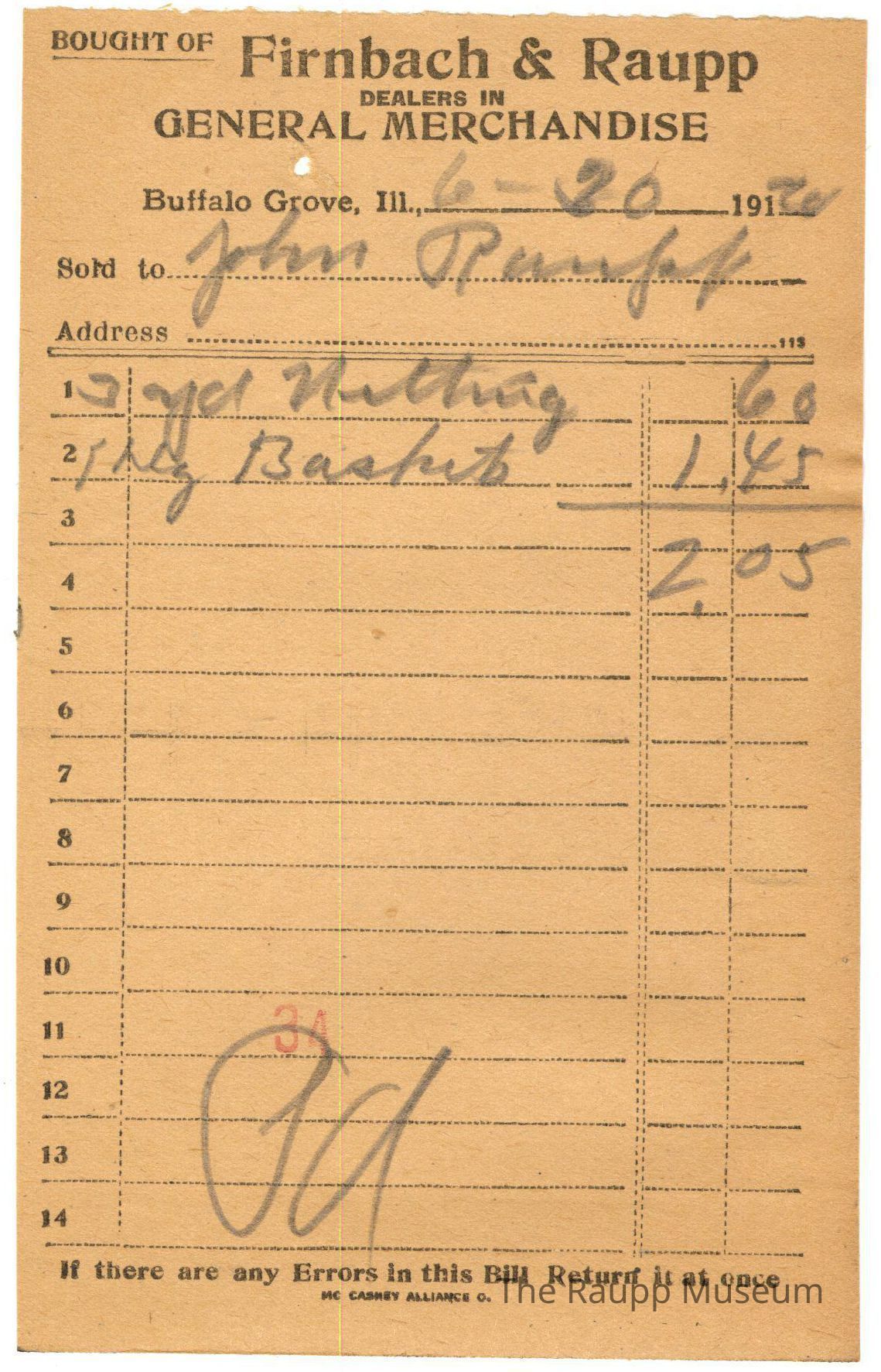 One (1) Firnbach and Raupp store receipt from June 30, 1920. Receipt is rectangular with black printed text and written notes in pencil. The receipt is for John Raupp, who bought three yards (written as yd) nettings and one dozen (dz) baskets for $1.45. Bill total was $2.05. There's a red stamp of 34 close to the bottom, with the bill marked as paid.