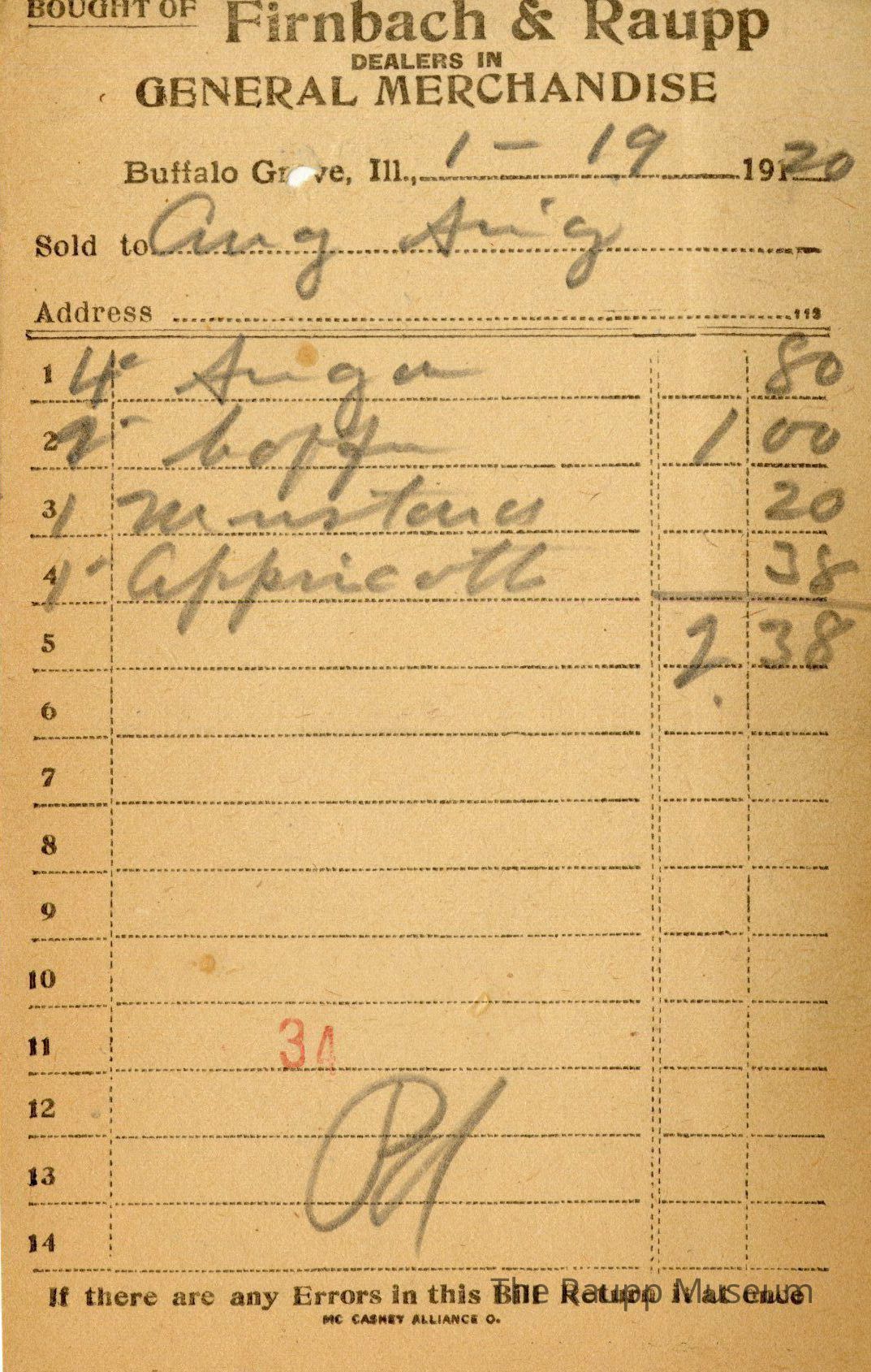 One (1) Firnbach and Raupp store receipt from January 19, 1920. Receipt is rectangular with black printed text and handwritten notes in pencil. The receipt is for Aug (August) Seig who purchased four pounds of sugar for $0.80, two pounds of coffee for $1.00, one mustard for $0.20, and one pound of appricott for $0.38. The bill total comes out to $2.38. On the eleventh line there is a red stamped 34 and below it the bill is marked as paid.