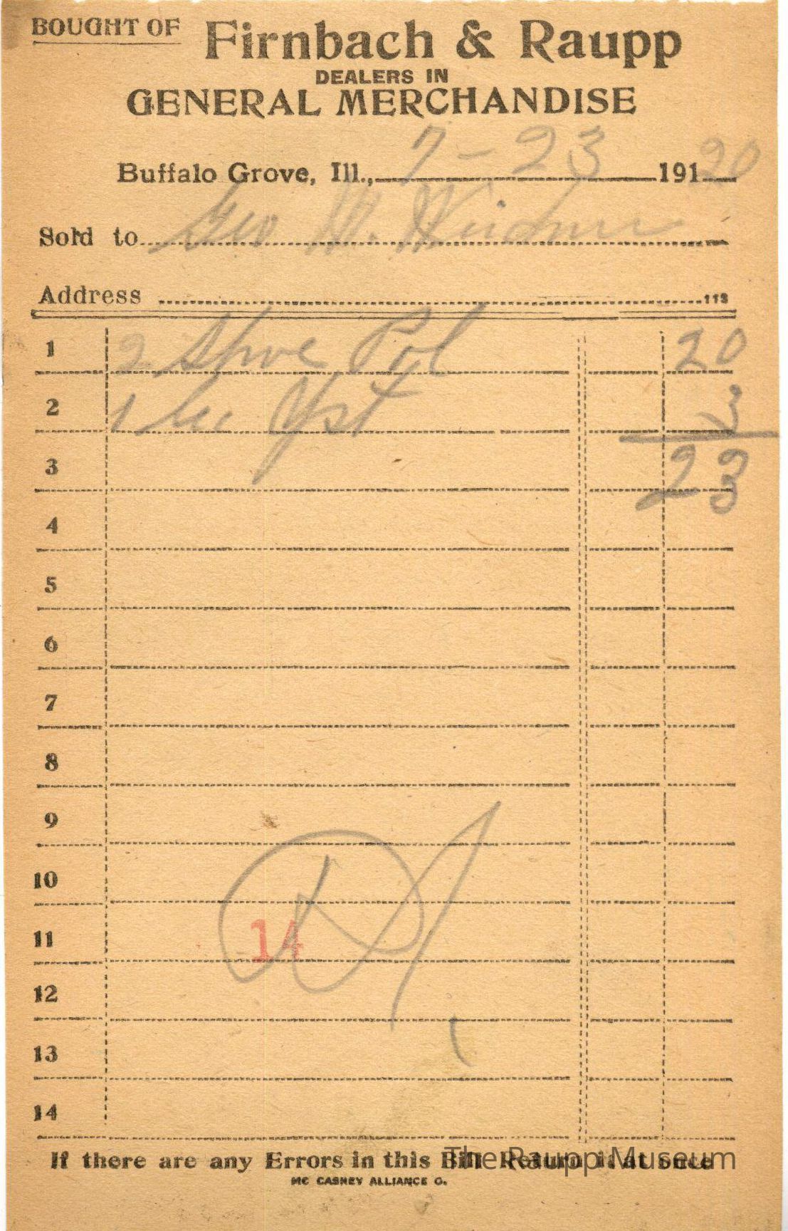 The black text is as follows, Bought of Firnbach and Raupp; Dealers in; General Merchandise; Buffalo Grove Ill.; Sold to; Address; If there are any Errors in this Bill Return it at once; MC CASKEY ALLIANCE O.