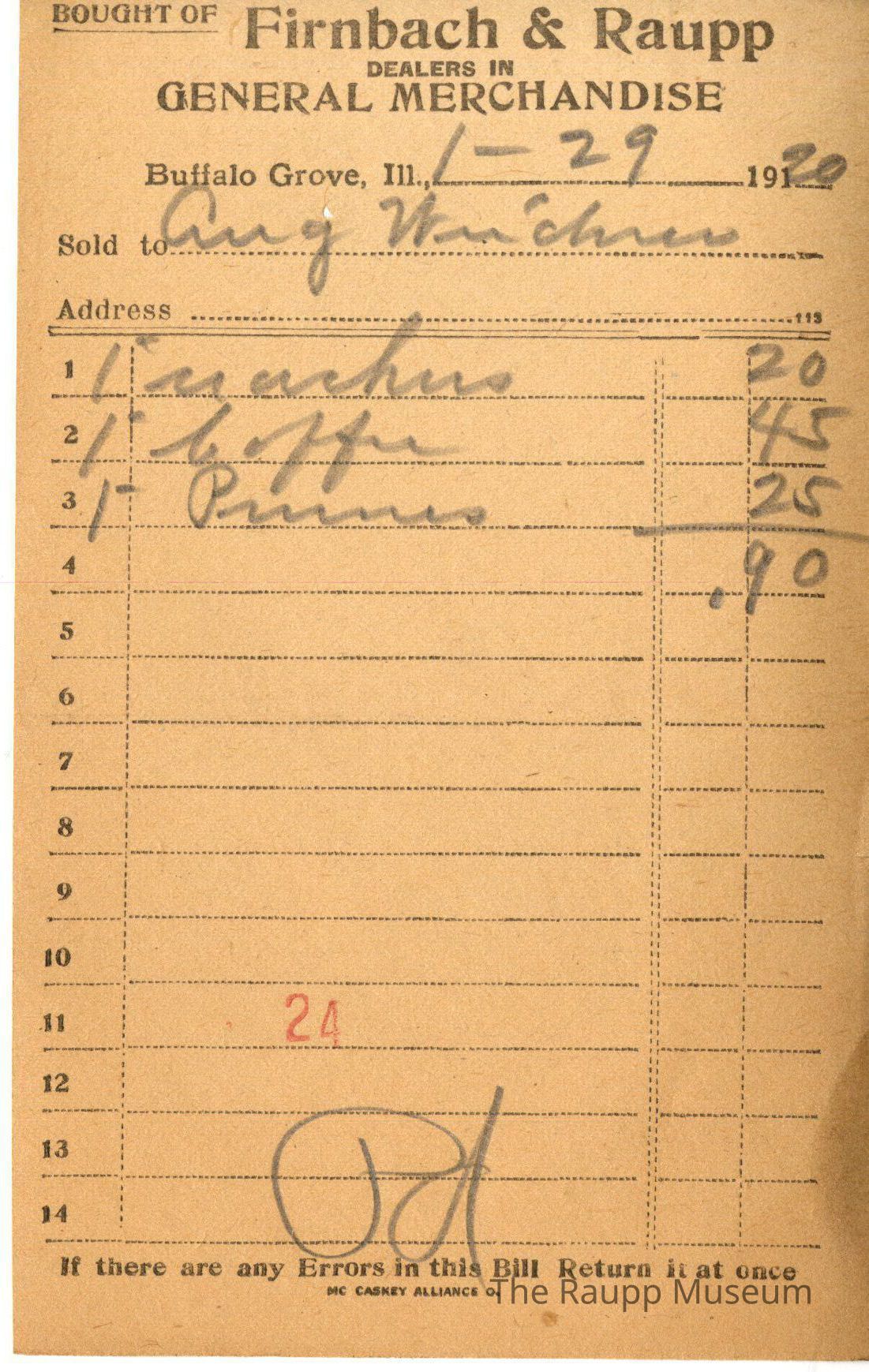The black text is as follows, from top to bottom: "Bought of Firnbach and Raupp dealers in GENERAL MERCHANDISE" Buffalo Grove Ill.; Sold to address; if there are any Errors in this Bill Return it at once; MC CASKEY ALLIANCE O."Archive Details