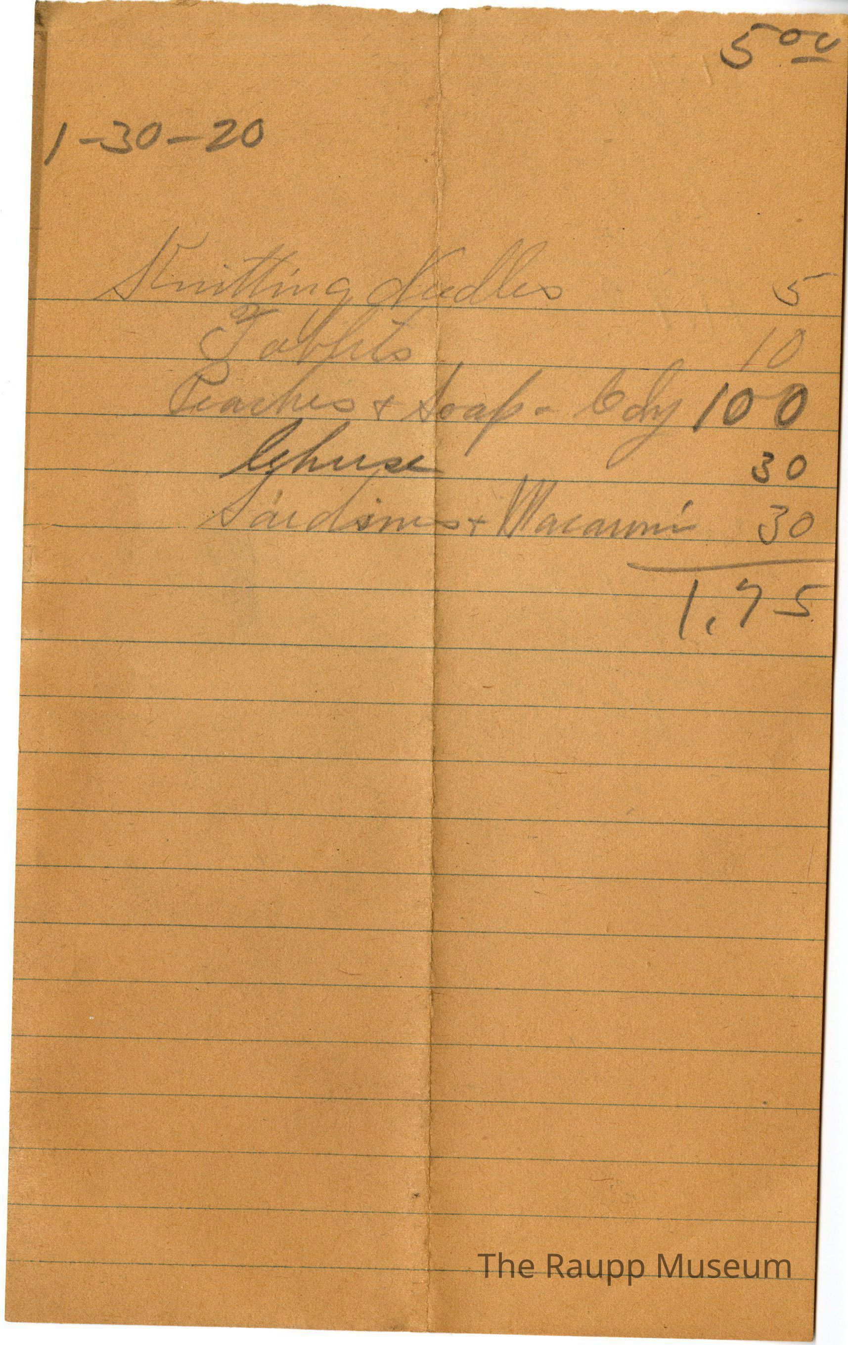 One (1) Firnbach and Raupp store receipt from January 30, 1920. Receipt is rectangular with handwritten text on a piece of paper with blue-print lines for writing. The receipt is for knitting needles for $0.05, tablets for $0.10, peaches & soap & candy for $1.00, Lihaes (?) for $0.30, and sardines and macaroni for $0.30. The bill is totaled to $1.75. No name is mentioned for the buyer.