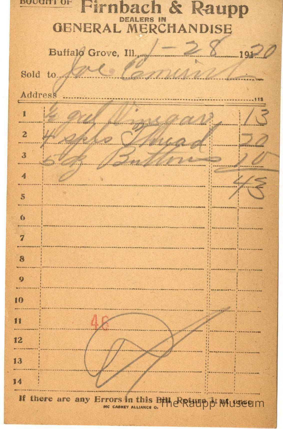 One (1) Firnbach and Raupp store receipt from January 28, 1920. Receipt is rectangular with black printed text and handwritten notes in pencil. The receipt is for Joe Emmerich who purchased a half gallon of vinegar for $0.13, four spools of thread for $0.20, and five ounces of butter for $0.10. The bill total comes out to $0.43. There is a red stamp of 46 on the eleventh line and beneath the stamp the bill is marked as paid.