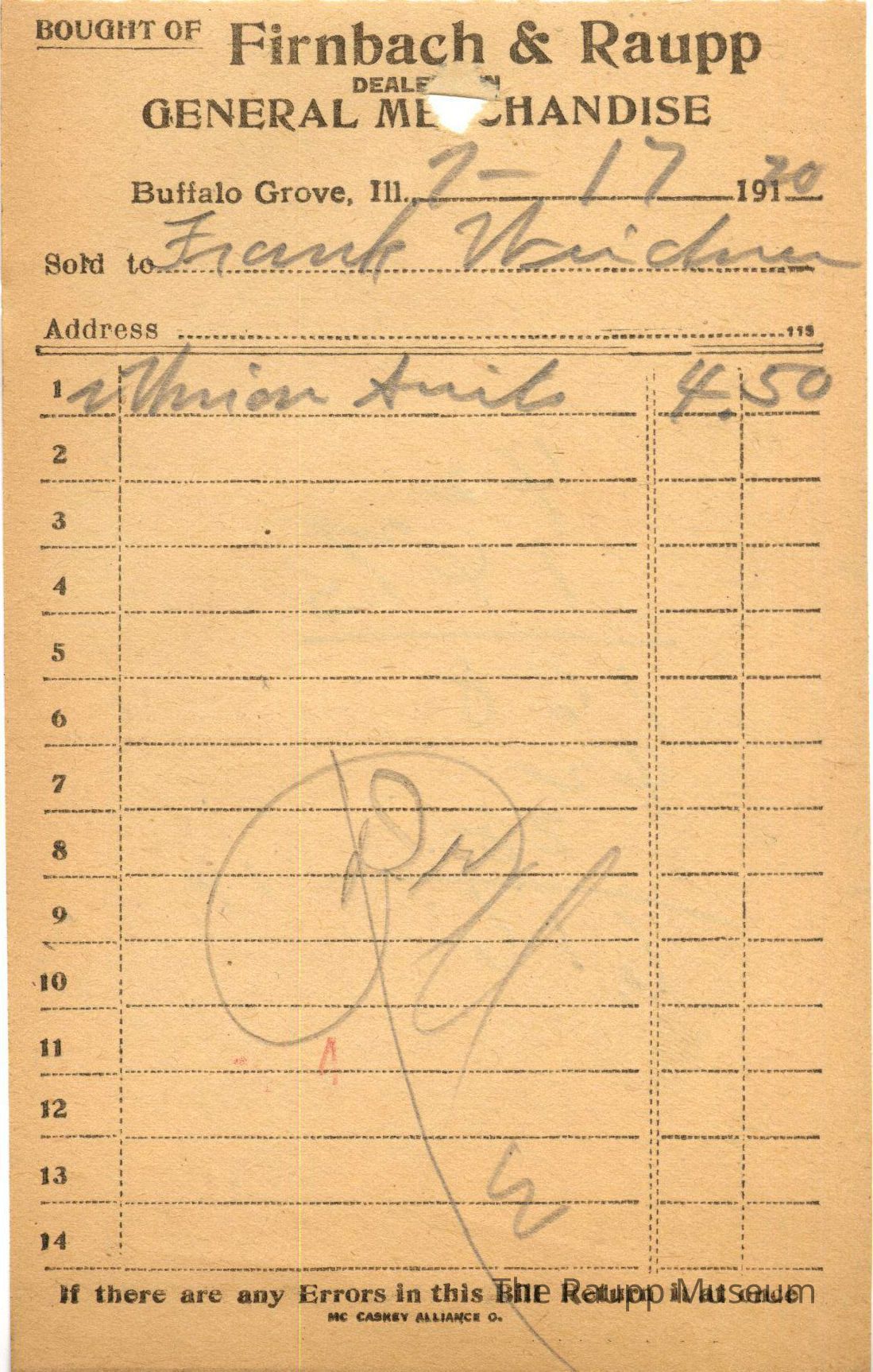 The black text is as follows, Bought of Firnbach and Raupp; Dealers in; General Merchandise; Buffalo Grove Ill.; Sold to; Address; If there are any Errors in this Bill Return it at once; MC CASKEY ALLIANCE O.