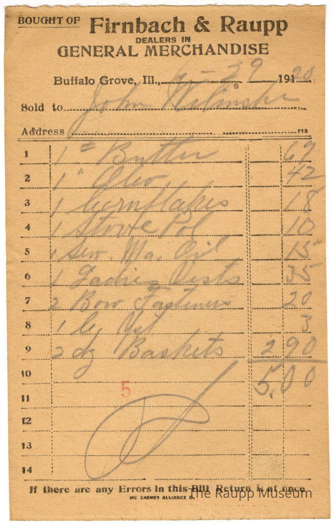 The black text is as follows, from top to bottom: Bought of Firnbach & Raupp, Dealers in GENERAL MERCHANDISE; Buffalo Grove Ill.; Sold to; Address; If there are any Errors in this Bill Return it at once; MC CASKEY ALLIANCE O.Archive Details