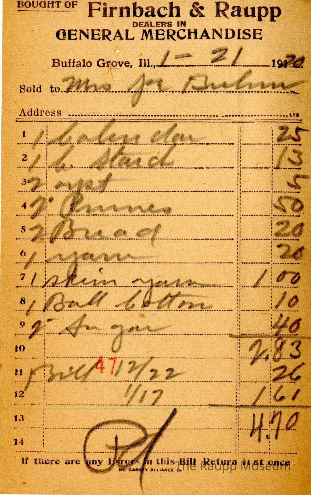 The black text is as follows, from top to bottom: "Bought of Firnbach and Raupp dealers in GENERAL MERCHANDISE" Buffalo Grove Ill.; Sold to; address; if there are any Errors in this Bill Return it at once; MC CASKEY ALLIANCE O."Archive Details