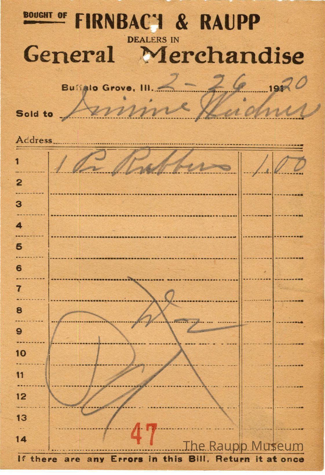 The black text is as follows, from top to bottom: "Bought of Firnbach and Raupp; Dealers in GENERAL MERCHANDISE; Buffalo Grove, Ill.; Sold to; Address; if there are any Errors in this Bill Return it at once"Dimensions