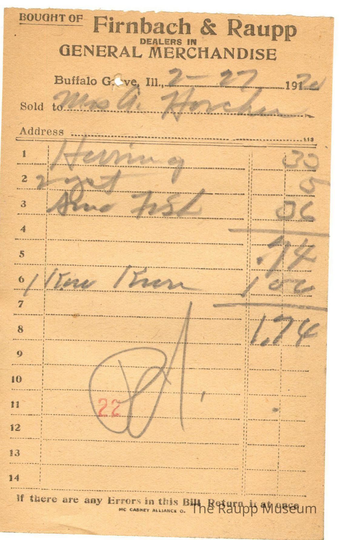 The black text is as follows, from top to bottom: "Bought of Firnbach and Raupp; Dealers in GENERAL MERCHANDISE; Buffalo Grove, Ill.; Sold to; Address; if there are any Errors in this Bill Return it at once; MC CASKEY ALLIANCE O."Archive Details