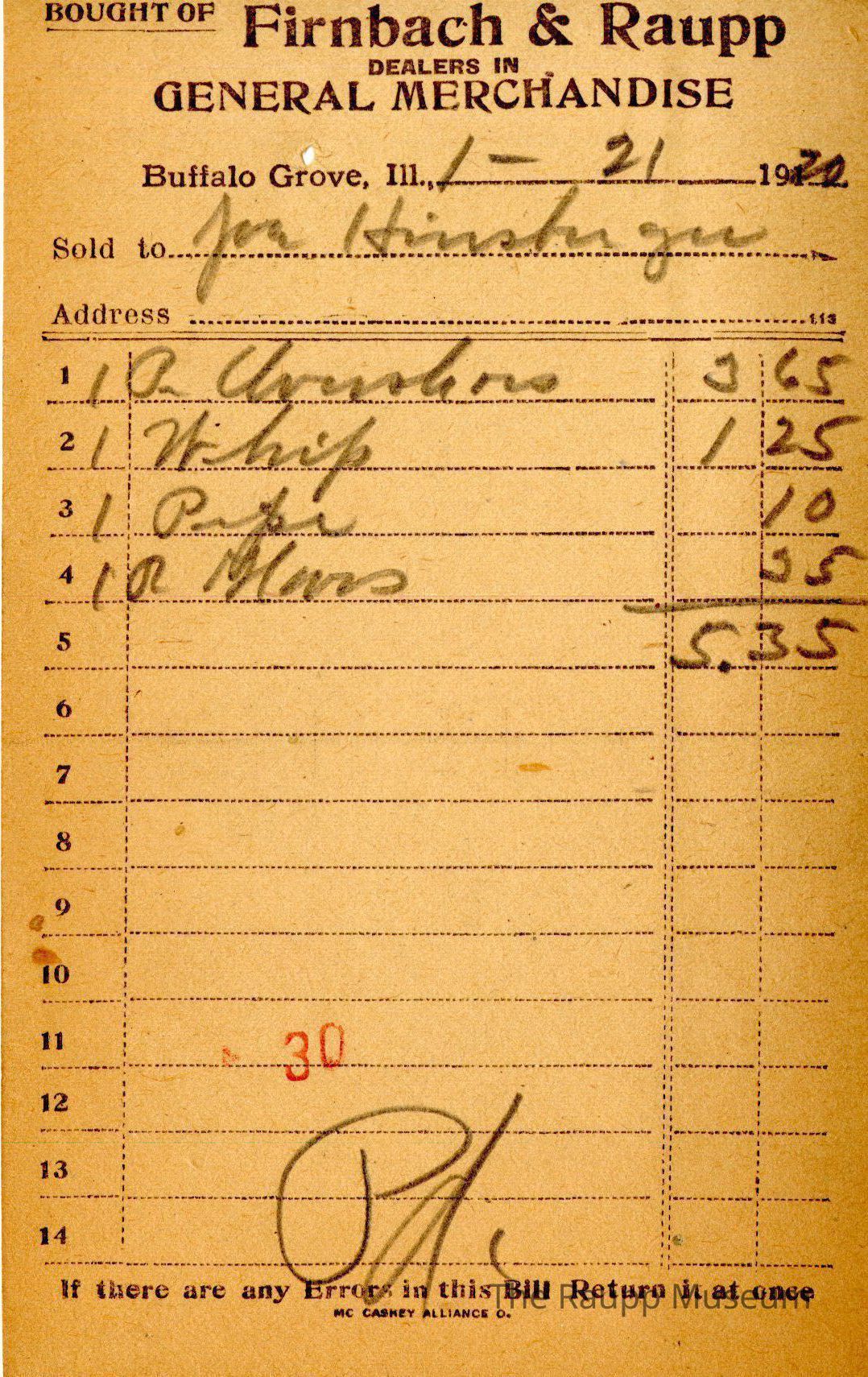 The black text is as follows, from top to bottom: "Bought of Firnbach and Raupp dealers in GENERAL MERCHANDISE" Buffalo Grove Ill.; Sold to; address; if there are any Errors in this Bill Return it at once; MC CASKEY ALLIANCE O."Archive Details