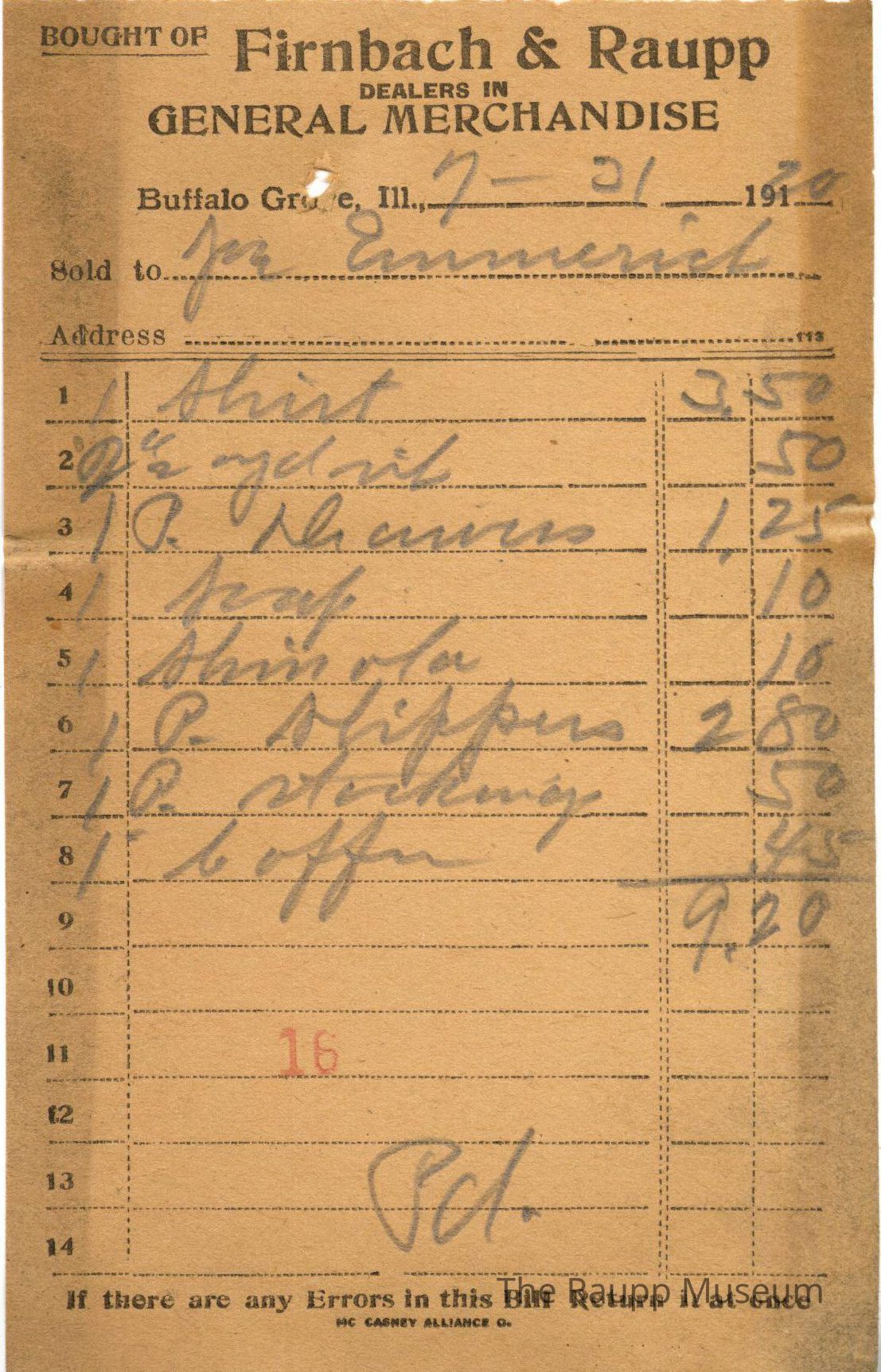 One (1) Firnbach and Raupp store receipt from July 31, 1920. Receipt is rectangular with black printed text and written notes in pencil. The receipt is for Joe Emmerich, who bought one shirt for $3.50, two 1/2 yards (yd) of (?) for $0.50, one pair (p.) of drawers for $1.25, one soap for $0.10, one shinola for $0.10, one pair (p.) of slippers for $2.80, one pair (p.) of stockings for $0.50, and one coffee for $0.45. The bill total is $9.20.