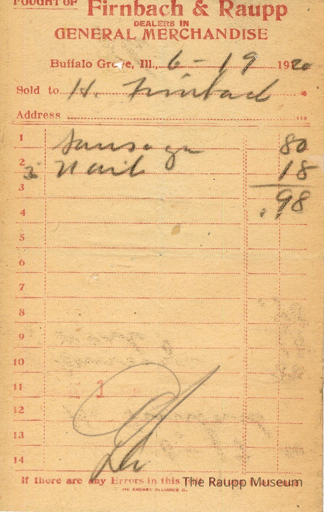 One (1) Firnbach and Raupp store receipt from June 19th, 1920. Receipt is rectangular with red printed text and written notes in pencil. The receipt is for H Firnbach who bought 1 sausage for $0.80 and 3 nails for $0.18 for a total of $0.98. There's a red stamp of 1 close to the bottom, with the bill marked as paid.