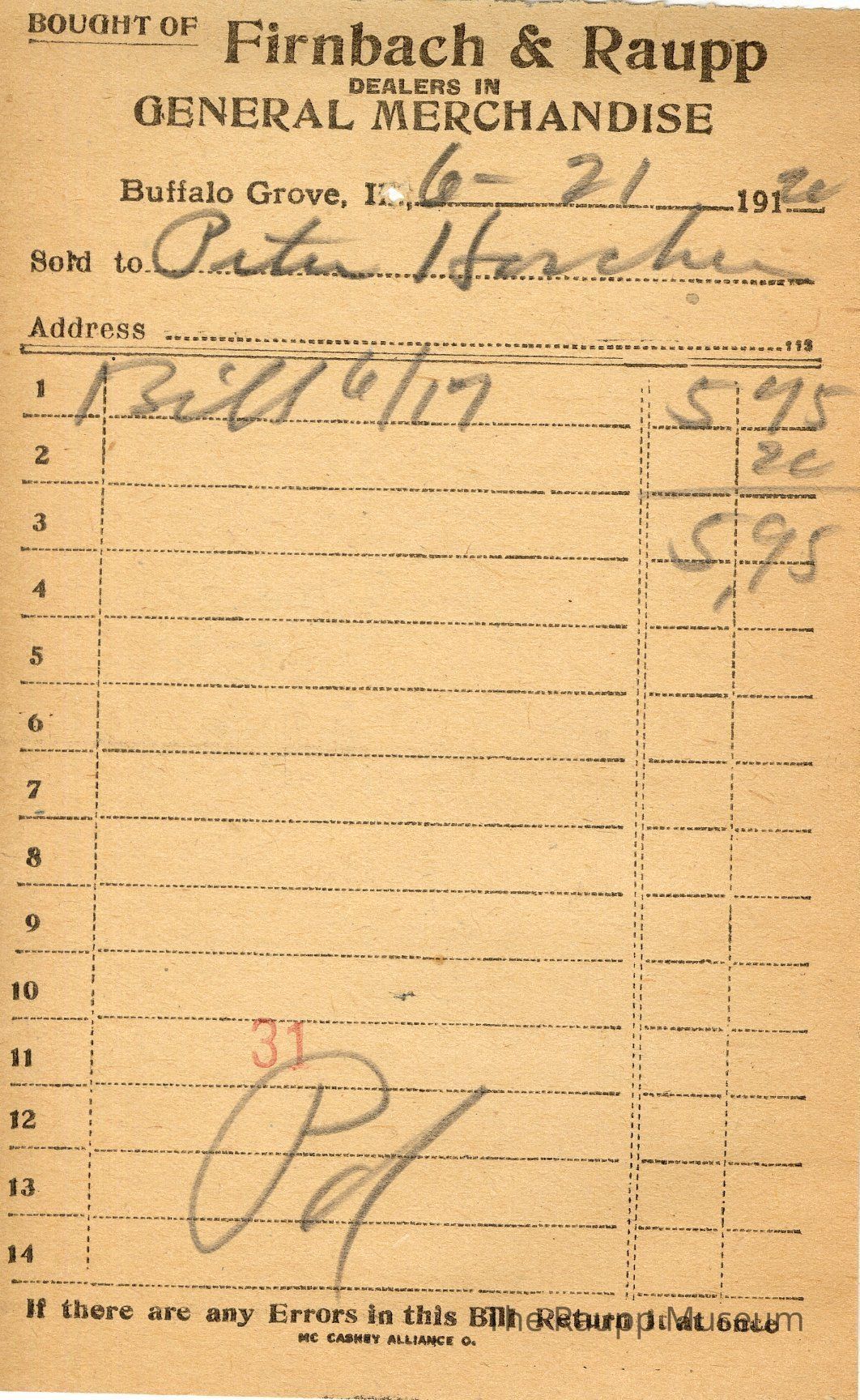 The black text is as follows, from top to bottom bought of Firnback & Raupp; Dealers in General Merchandise; Buffalo Grove, Ill.; Sold to; Address; If there are any Errors in this Bill Return it at once; MC CASKEY ALLIANCE O.Archive Details