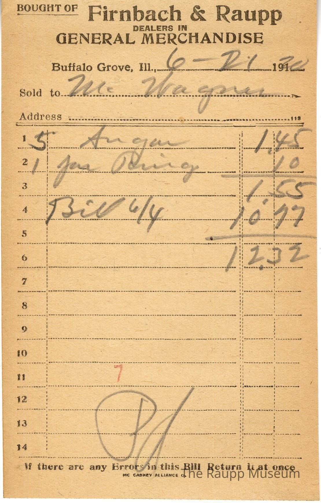 The black text is as follows, from top to bottom bought of Firnback & Raupp; Dealers in General Merchandise; Buffalo Grove, Ill.; Sold to; Address; If there are any Errors in this Bill Return it at once; MC CASKEY ALLIANCE O.Archive Details
