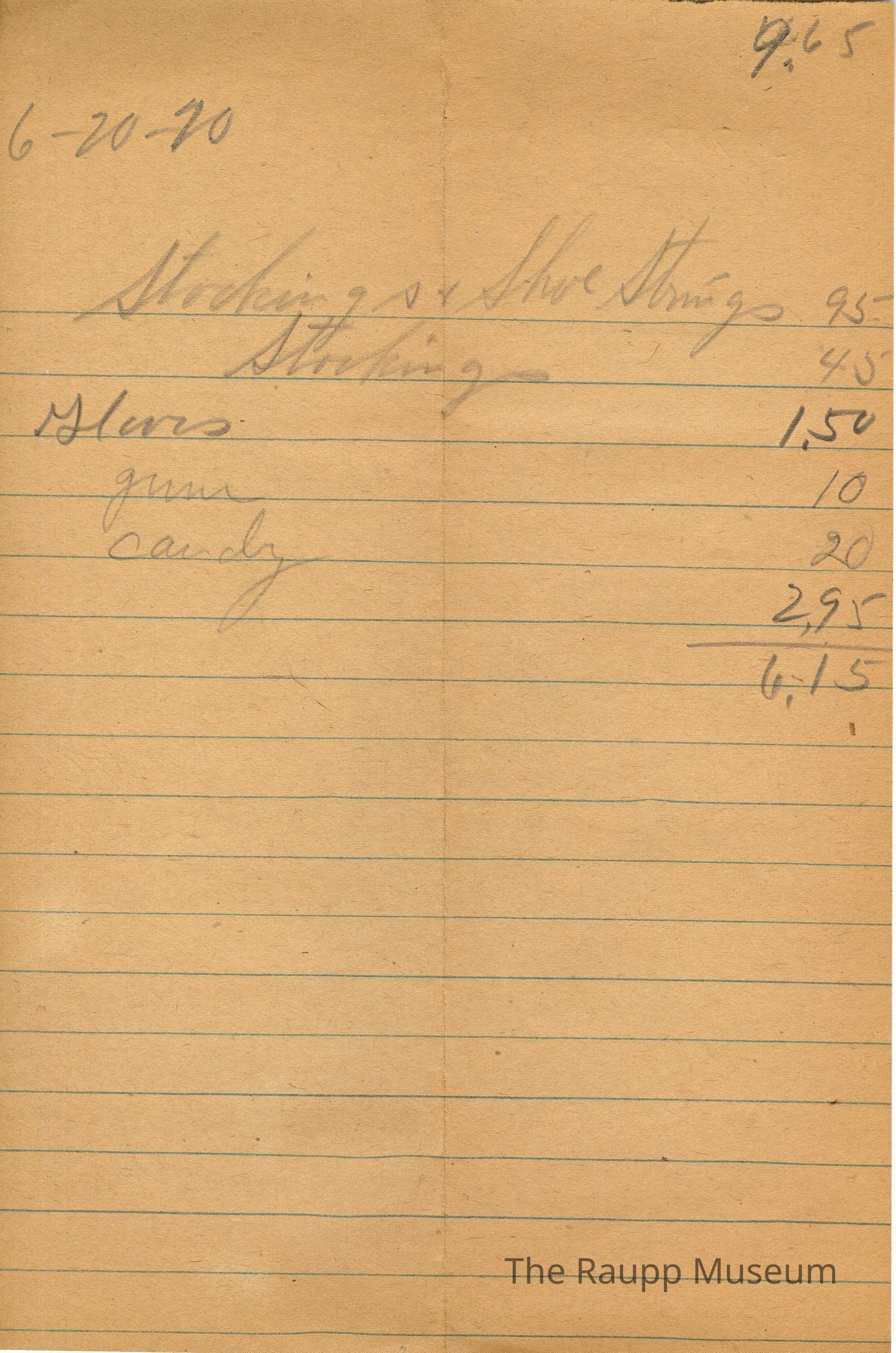 One receipt from June 20th, 1920. Receipt is written on lined paper. It does not state who the receipt is for. The paper lists a series of items: Stockings, shoe strings, stockings, gloves, gum, and candy for a total of $6.15. There is addition on the back of the paper.Archive Details