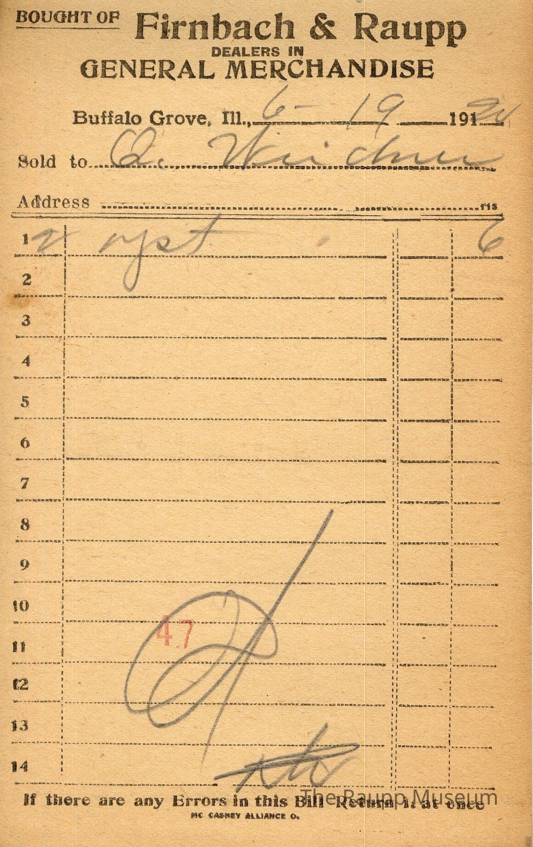 The black text is as follows, from top to bottom bought of Firnback & Raupp; Dealers in General Merchandise; Buffalo Grove, Ill.; Sold to; Address; If there are any Errors in this Bill Return it at once; MC CASKEY ALLIANCE O.Archive Details