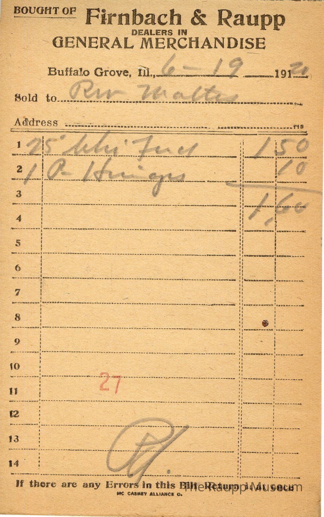 The black text is as follows, from top to bottom bought of Firnback & Raupp; Dealers in General Merchandise; Buffalo Grove, Ill.; Sold to; Address; If there are any Errors in this Bill Return it at once; MC CASKEY ALLIANCE O.Archive Details