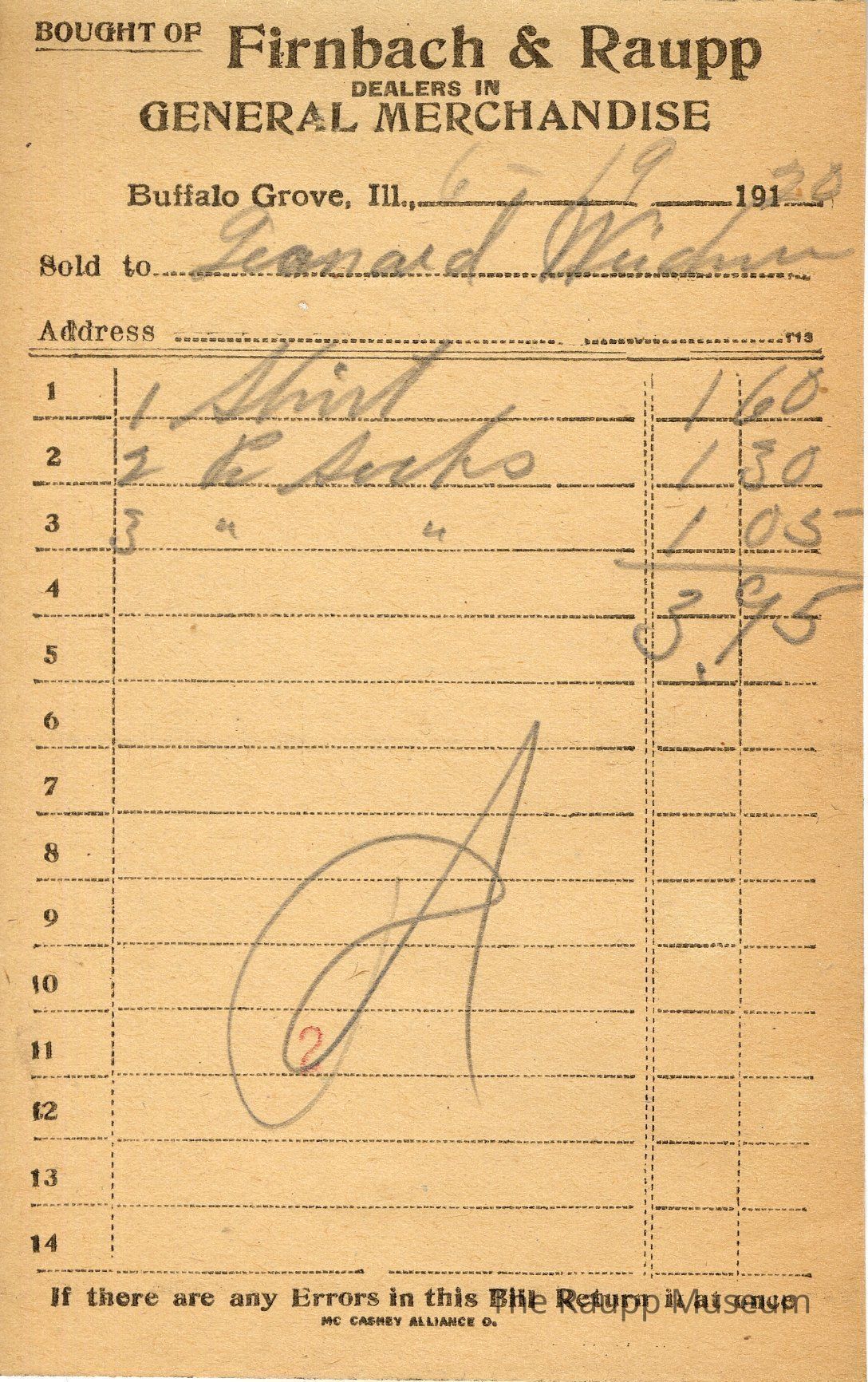The black text is as follows, from top to bottom bought of Firnback & Raupp; Dealers in General Merchandise; Buffalo Grove, Ill.; Sold to; Address; If there are any Errors in this Bill Return it at once; MC CASKEY ALLIANCE O.Archive Details