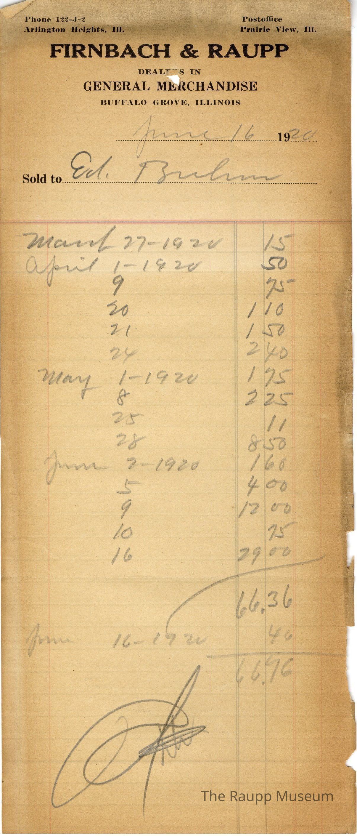 One (1) Firnbach and Raupp store receipt from June 16th, 1920. Receipt is rectangular with black printed text and written notes in pencil. The receipt is for Ed Brehm. The receipt shows previous bills from March, April, May, and June 1920 for a total of $66.76. The bill marked as paid near the bottom.