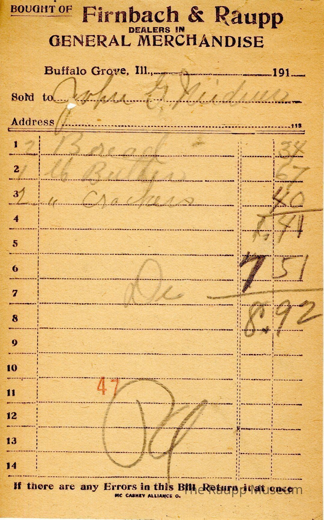 The black text is as follows, from top to bottom bought of Firnback & Raupp; Dealers in General Merchandise; Buffalo Grove, Ill.; Sold to; Address; If there are any Errors in this Bill Return it at once; MC CASKEY ALLIANCE O.Archive Details