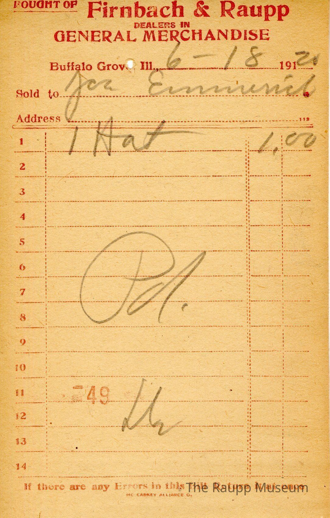 One (1) Firnbach and Raupp store receipt from June 18th, 1920. Receipt is rectangular with red printed text and written notes in pencil. The receipt is for Joe Emmerich who bought 1 Hat for a total of $1.00. The receipt total is $1.00 There's a red stamp of 49 close to the bottom, with the bill marked as paid.