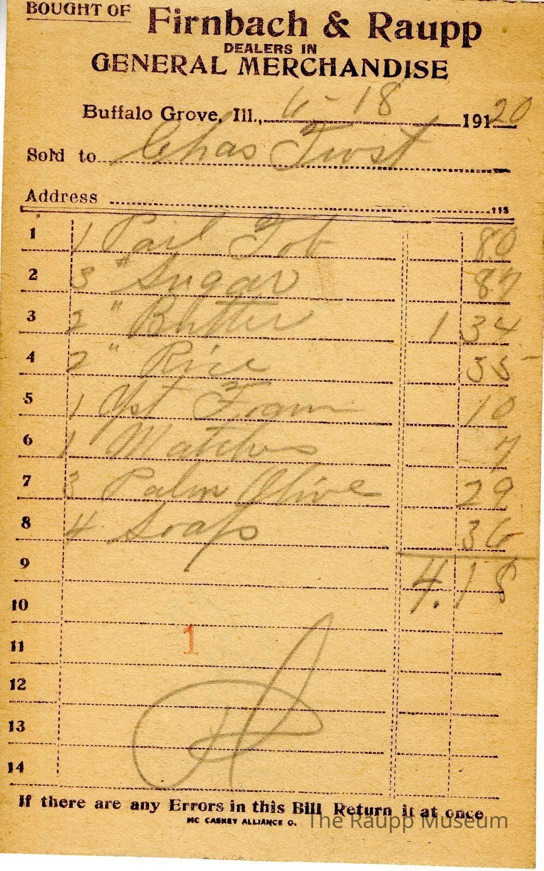 The black text is as follows, from top to bottom bought of Firnback & Raupp; Dealers in General Merchandise; Buffalo Grove, Ill.; Sold to; Address; If there are any Errors in this Bill Return it at once; MC CASKEY ALLIANCE O.Archive Details