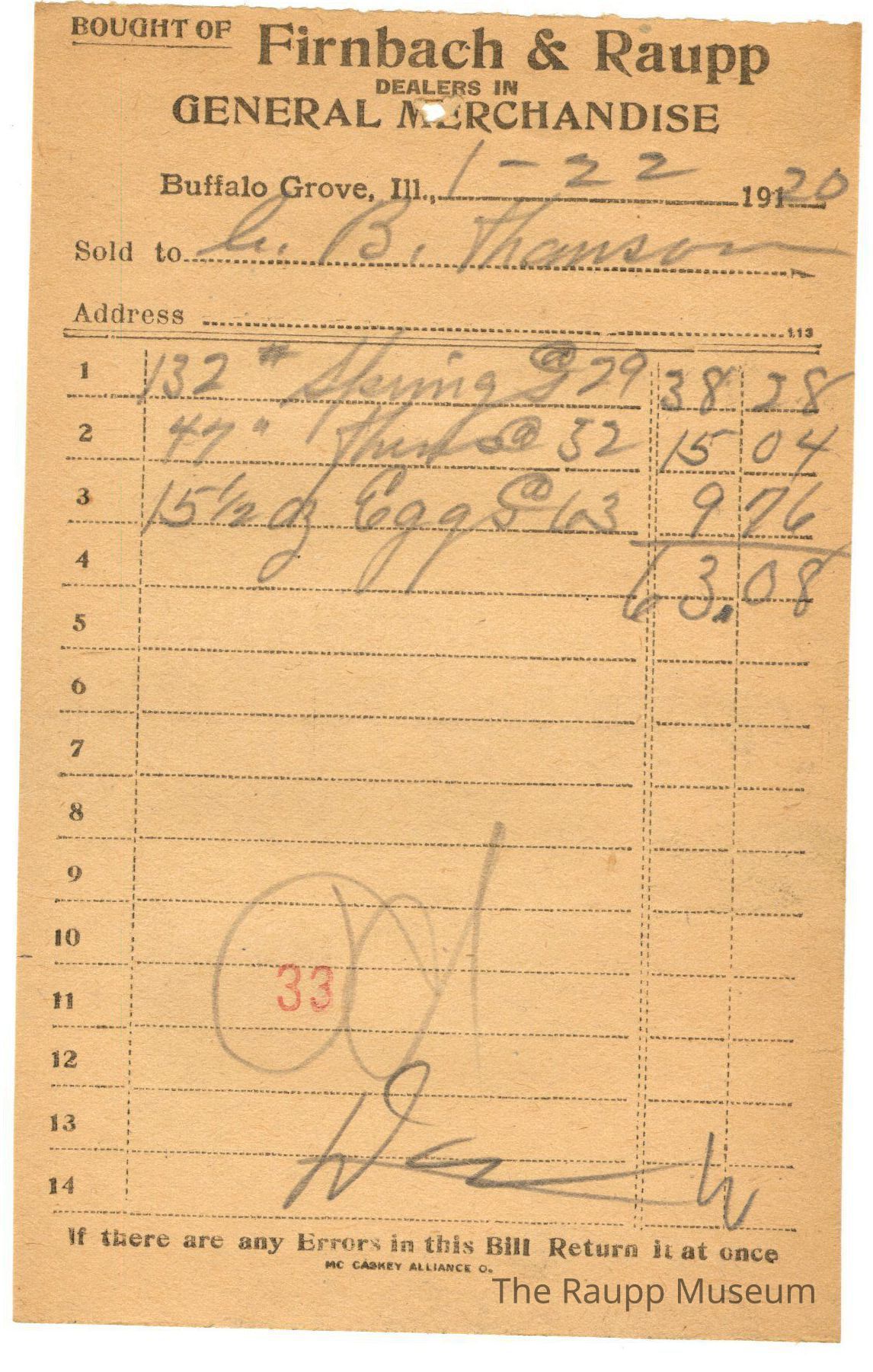 One (1) Firnbach and Raupp store receipt from Jamuary 22, 1920. Receipt is rectangular with black printed text and written notes in pencil. The receipt is for B. Hanson(?), who bought one hundred thirty-two springs at $0.29 for $38.28, forty-seven pounds Hunds(?) at $0.32 each for $15.04, and fifteen and a half dozen eggs for $9.76. The bill total is $63.08. There is a red stamp of 33 close to the bottom, with the bill marked as paid.