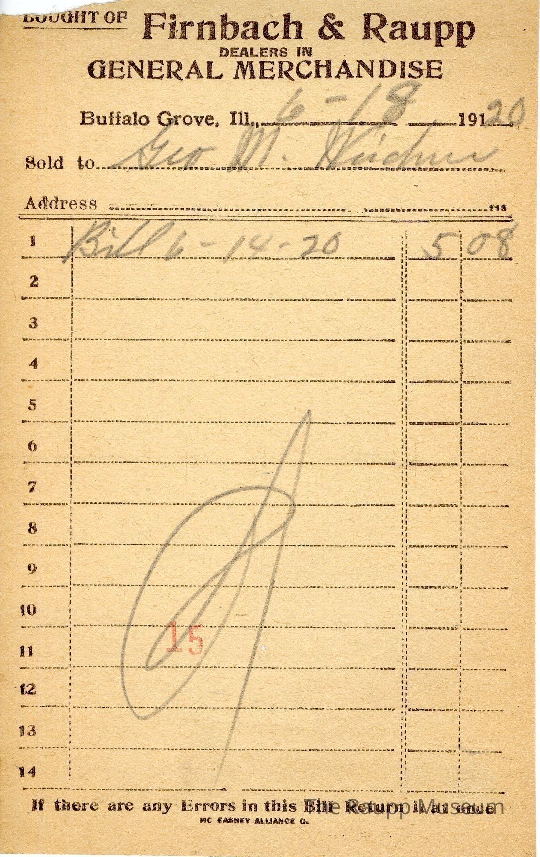 The black text is as follows, from top to bottom bought of Firnback & Raupp; Dealers in General Merchandise; Buffalo Grove, Ill.; Sold to; Address; If there are any Errors in this Bill Return it at once; MC CASKEY ALLIANCE O.Archive Details