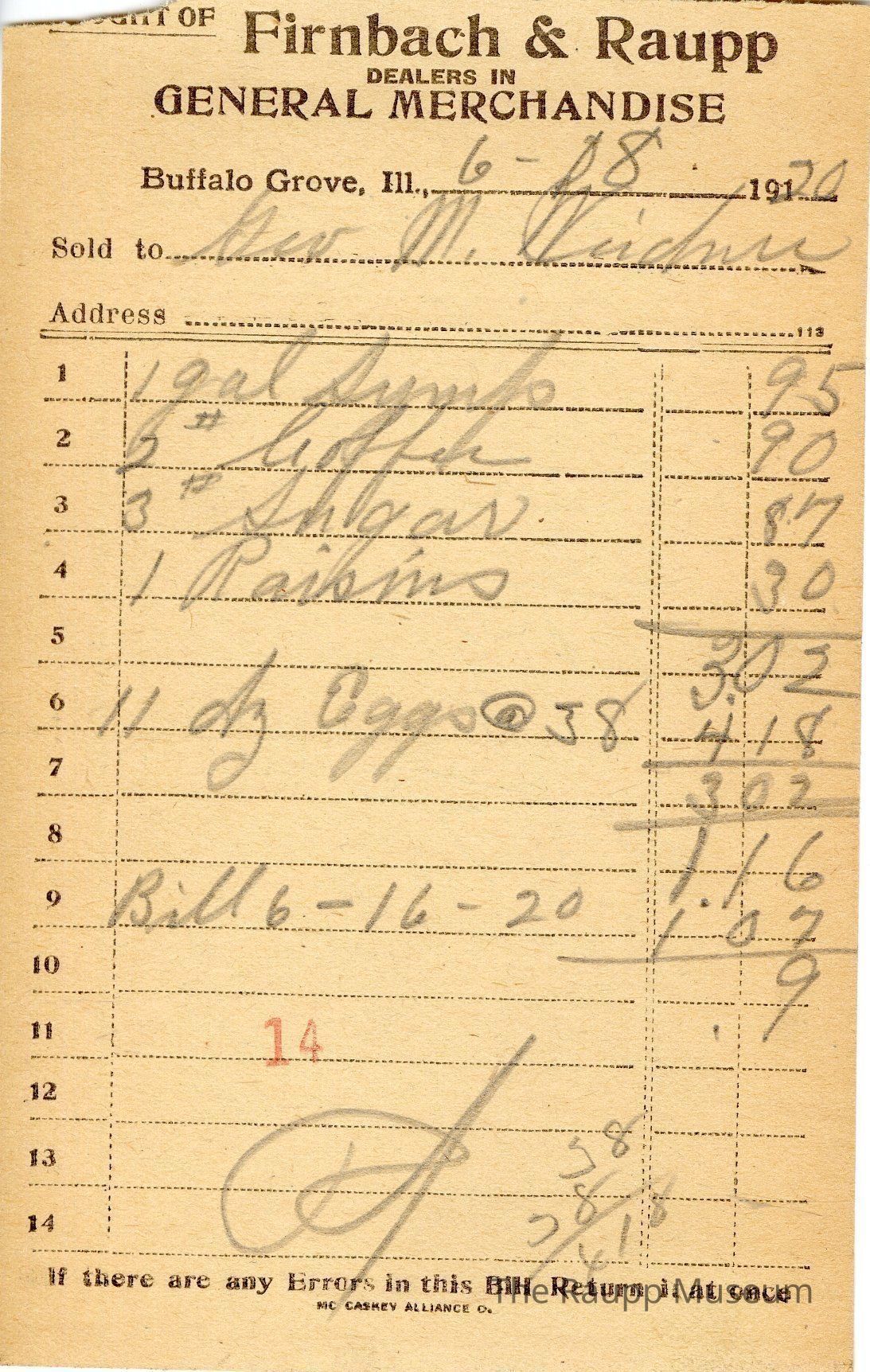 The black text is as follows, from top to bottom bought of Firnback & Raupp; Dealers in General Merchandise; Buffalo Grove, Ill.; Sold to; Address; If there are any Errors in this Bill Return it at once; MC CASKEY ALLIANCE O.Archive Details