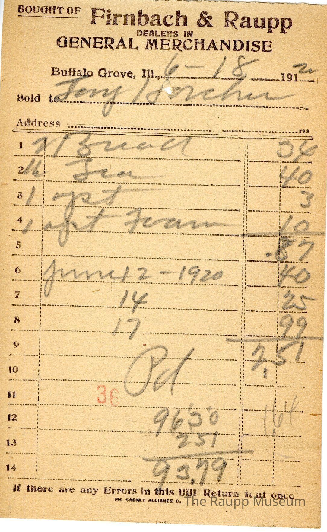 The black text is as follows, from top to bottom bought of Firnback & Raupp; Dealers in General Merchandise; Buffalo Grove, Ill.; Sold to; Address; If there are any Errors in this Bill Return it at once; MC CASKEY ALLIANCE O.Archive Details
