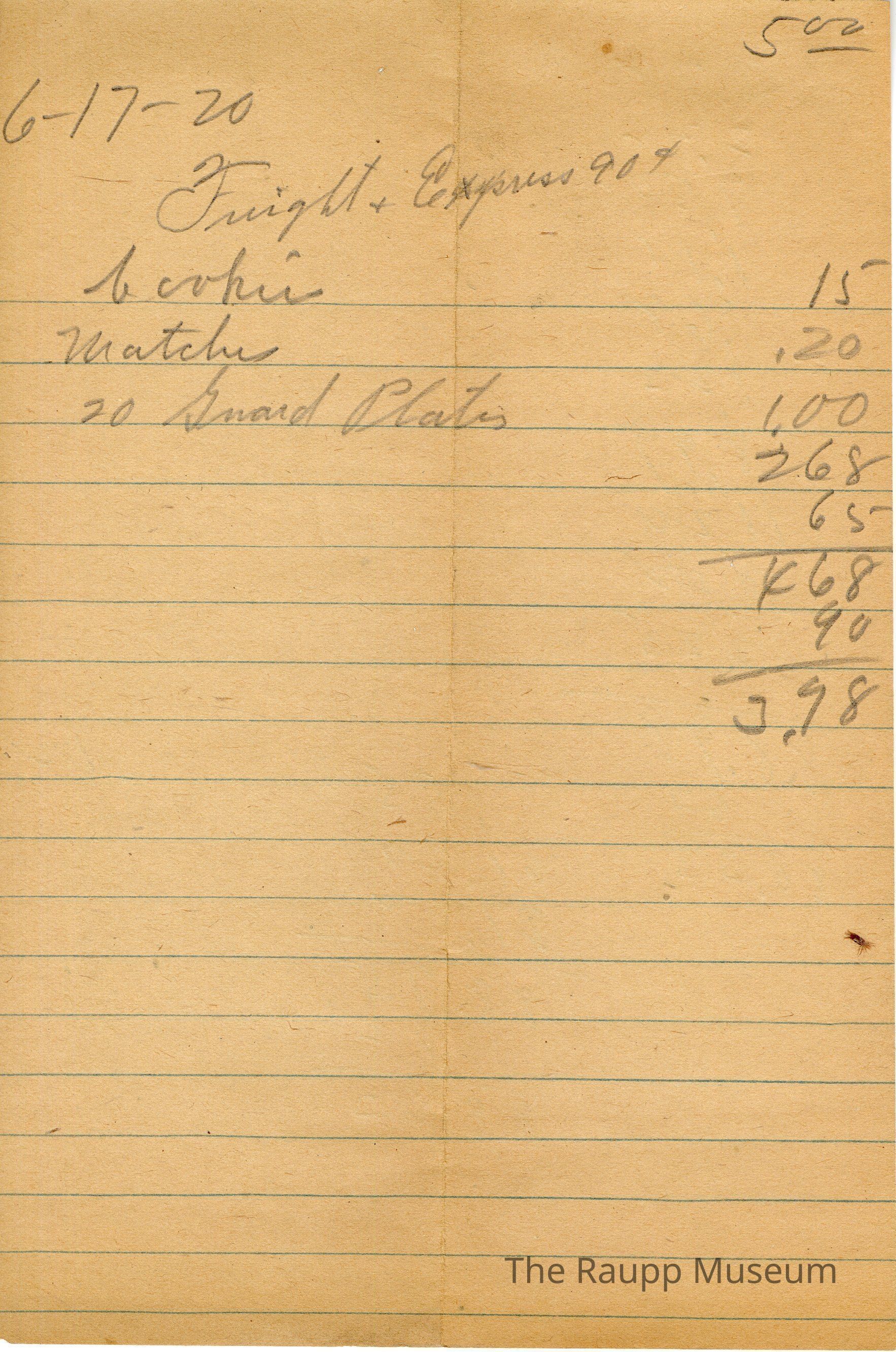 One receipt from June 17th, 1920. Receipt is written on lined paper. The top of the paper states "Freight and Express 90¢". The paper lists a series of items: Cookie, matches, and 20 Guard Plates for a total of $3.98. There is addition on the back of the paper.Archive Details