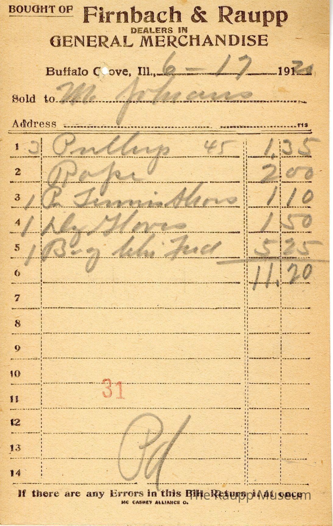 The black text is as follows, from top to bottom bought of Firnback & Raupp; Dealers in General Merchandise; Buffalo Grove, Ill.; Sold to; Address; If there are any Errors in this Bill Return it at once; MC CASKEY ALLIANCE O.Archive Details