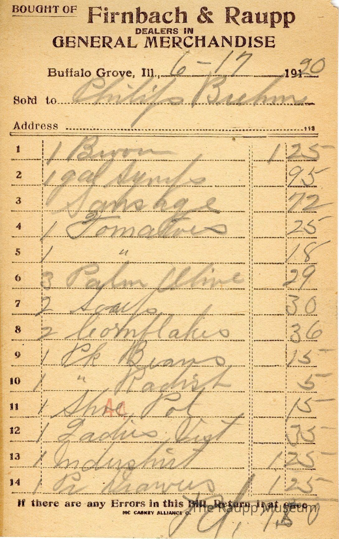 The black text is as follows, from top to bottom bought of Firnback & Raupp; Dealers in General Merchandise; Buffalo Grove, Ill.; Sold to; Address; If there are any Errors in this Bill Return it at once; MC CASKEY ALLIANCE O.Archive Details