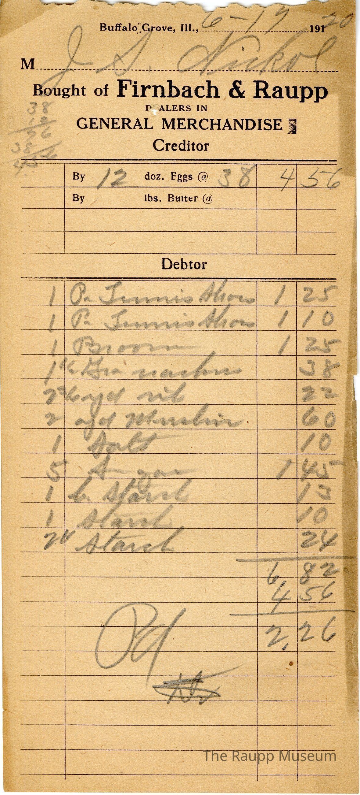One (1) Firnbach and Raupp store receipt from June 17th, 1920. Receipt is rectangular with black printed text and written notes in pencil. The receipt is for JS Nickol who sold 12 dozen eggs at $0.38/dozen for $4.56. He bought 1 pair tennis shoes for $1.25, 1 pair tennis shoes for $1.10, 1 broom for $1.25, 1 pound graham crackers for $0.38, 2 3/6 yard of vit? for $0.22, 2 yards muslin for $0.60, 1 salt for $0.10, 5 sugar for $1.45, 1 cup starch for $0.13, 1 starch for $0.10, 2 pounds? starch for $0.24 for a total of $6.82. $4.56 was subtracted from $6.82 for a final total of $2.26. The bill is marked as paid.