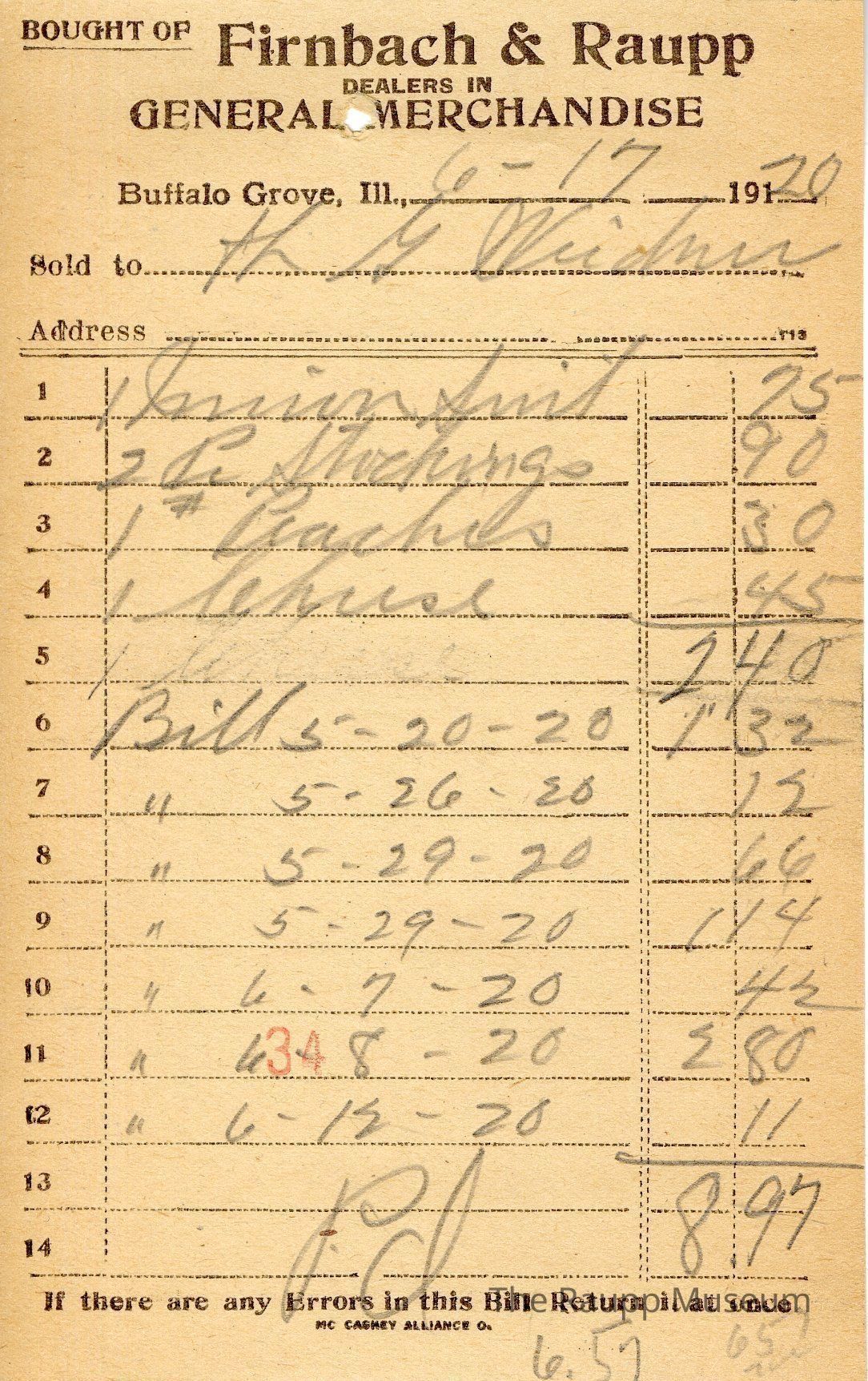 The black text is as follows, from top to bottom bought of Firnback & Raupp; Dealers in General Merchandise; Buffalo Grove, Ill.; Sold to; Address; If there are any Errors in this Bill Return it at once; MC CASKEY ALLIANCE O.Archive Details