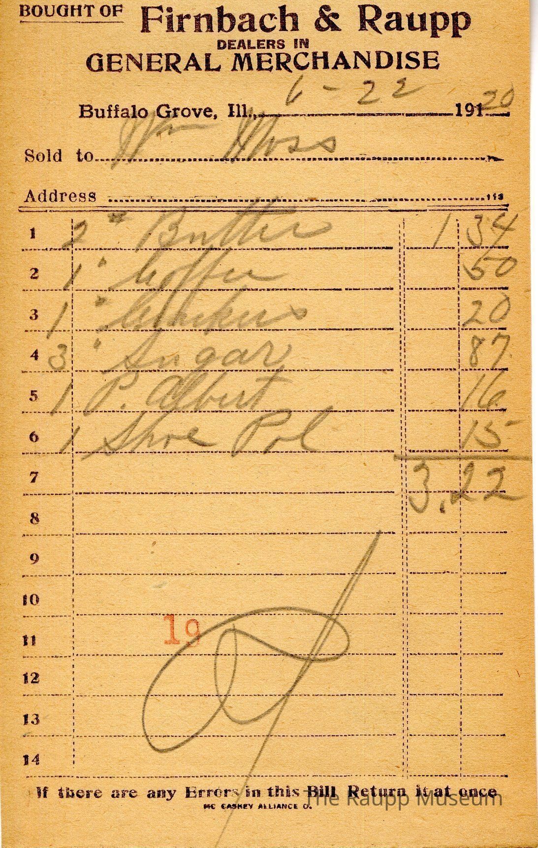 The black text is as follows, from top to bottom bought of Firnback & Raupp; Dealers in General Merchandise; Buffalo Grove, Ill.; Sold to; Address; If there are any Errors in this Bill Return it at once; MC CASKEY ALLIANCE O.Archive Details