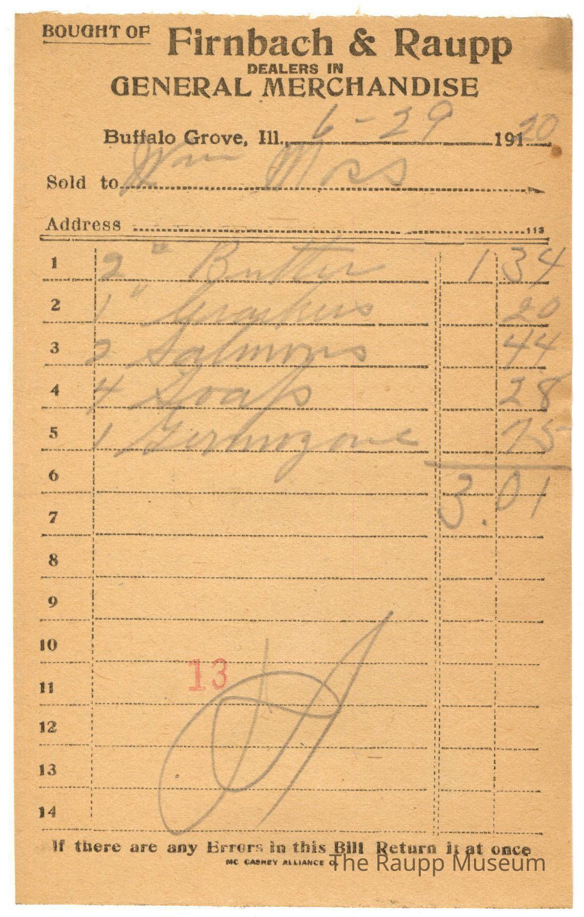 The black text is as follows, from top to bottom: Bought of Firnbach & Raupp, Dealers in GENERAL MERCHANDISE; Buffalo Grove Ill.; Sold to; Address; If there are any Errors in this Bill Return it at once; MC CASKEY ALLIANCE O.Archive Details