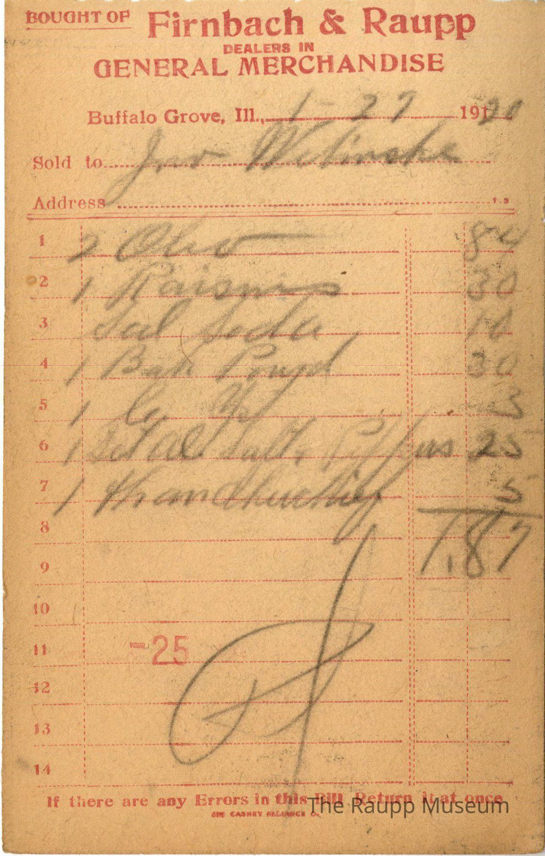 One (1) Firnbach and Raupp store receipt from January 27, 1920. Receipt is rectangular with red printed text and handwritten notes in pencil. The receipt is for James Wolinksy (?) who bought two oleo for $0.84, one order of raisins for $0.30, one gallon of soda for $0.10, one order of baking powder for $0.30, one order of yeast for $0.03, one pound of wheat puffers for $0.25, and one handkerchief for $0.05. The total comes out to $1.87. There is a red stamp of 25 on the eleventh line with the bill marked as paid below.