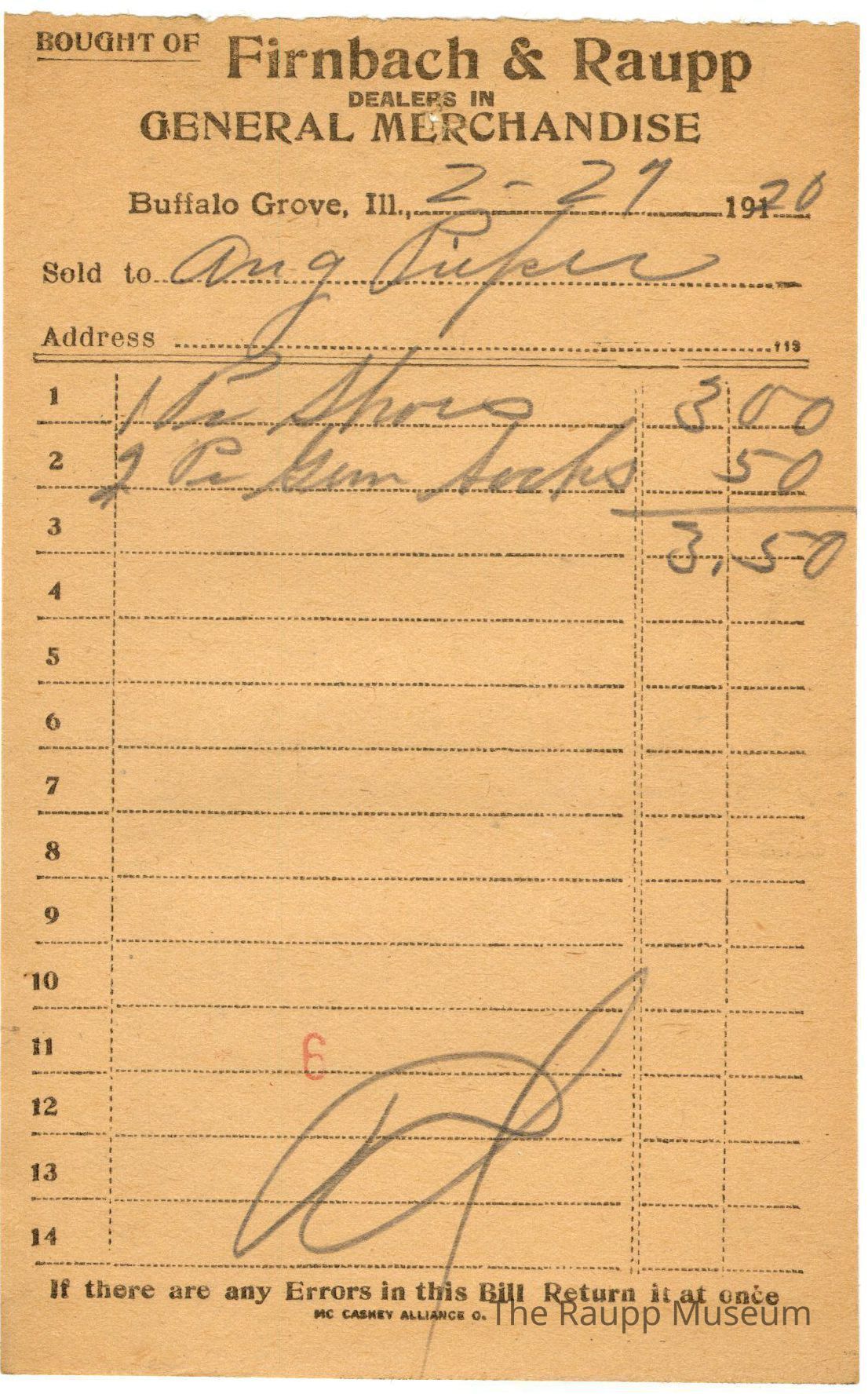The black text is as follows, from top to bottom: "Bought of Firnbach and Raupp; Dealers in GENERAL MERCHANDISE; Buffalo Grove, Ill.; Sold to; Address; if there are any Errors in this Bill Return it at once; MC CASKEY ALLIANCE CO."Archive Details