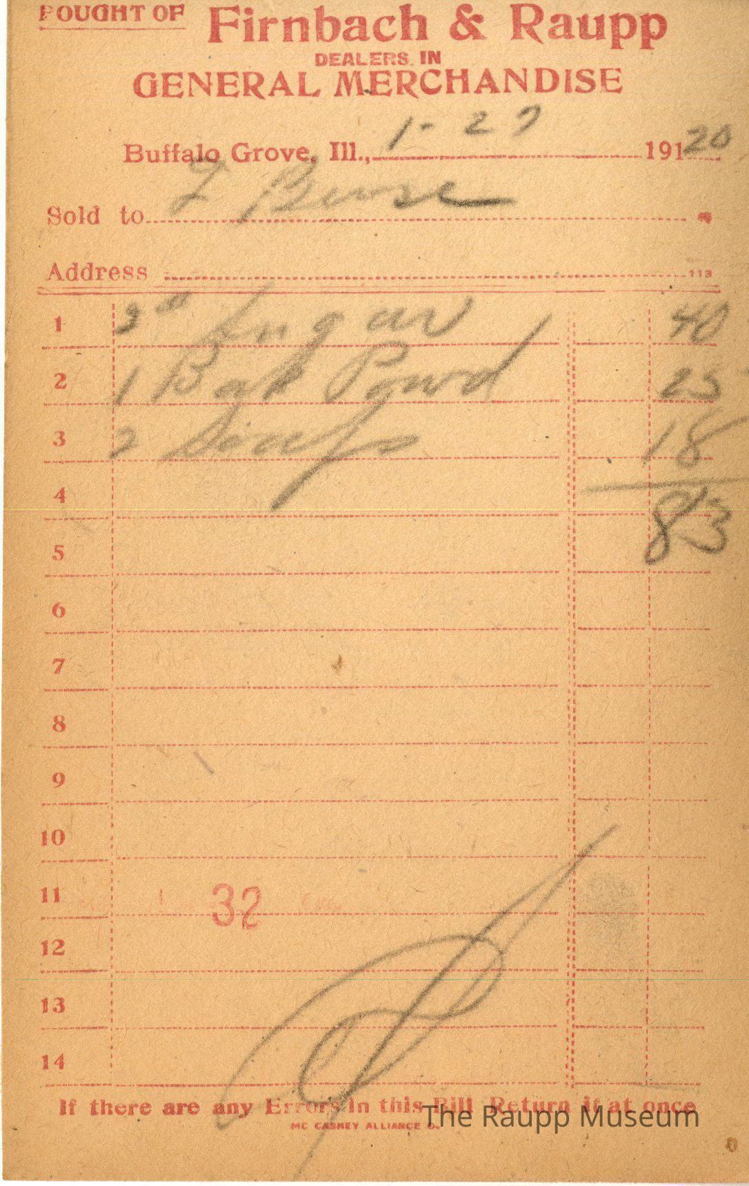 The red text is as follows, from top to bottom: "Bought of Firnbach and Raupp dealers in GENERAL MERCHANDISE" Buffalo Grove Ill.; Sold to; address; if there are any Errors in this Bill Return it at once; MC CASKEY ALLIANCE O."Archive Details