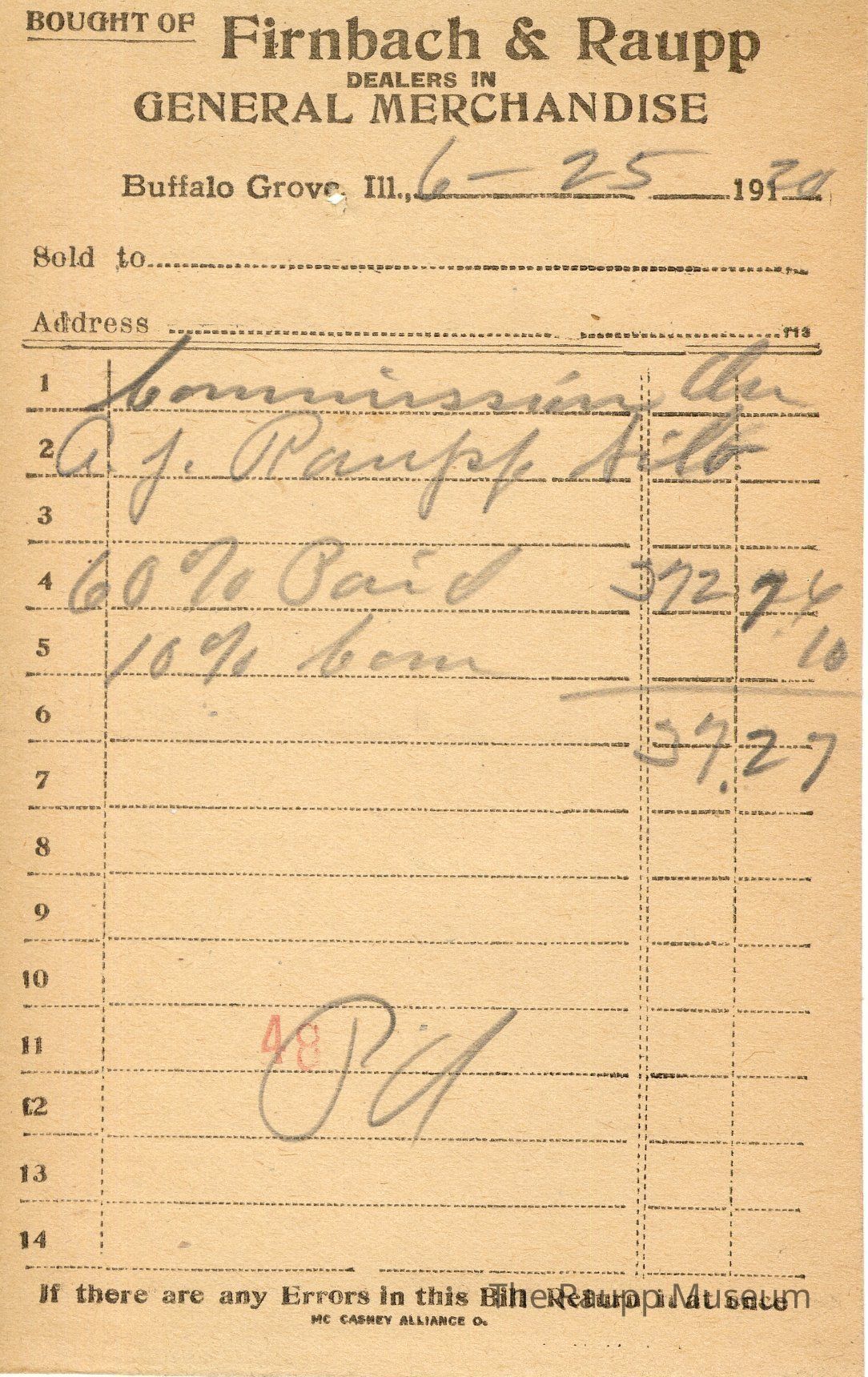 One (1) Firnbach and Raupp store receipt from June 25th, 1920. Receipt is rectangular with black printed text and written notes in pencil. The receipt states "Commission" across the top item line and "AJ Raupp Silo" on the line directly below. Two lines below AJ's name, "60% Paid 372.76" is written and "10% com 0.10 is written on the line directly below. The total is $37.27. There's a red stamp of 48 close to the bottom, with the bill marked as paid.